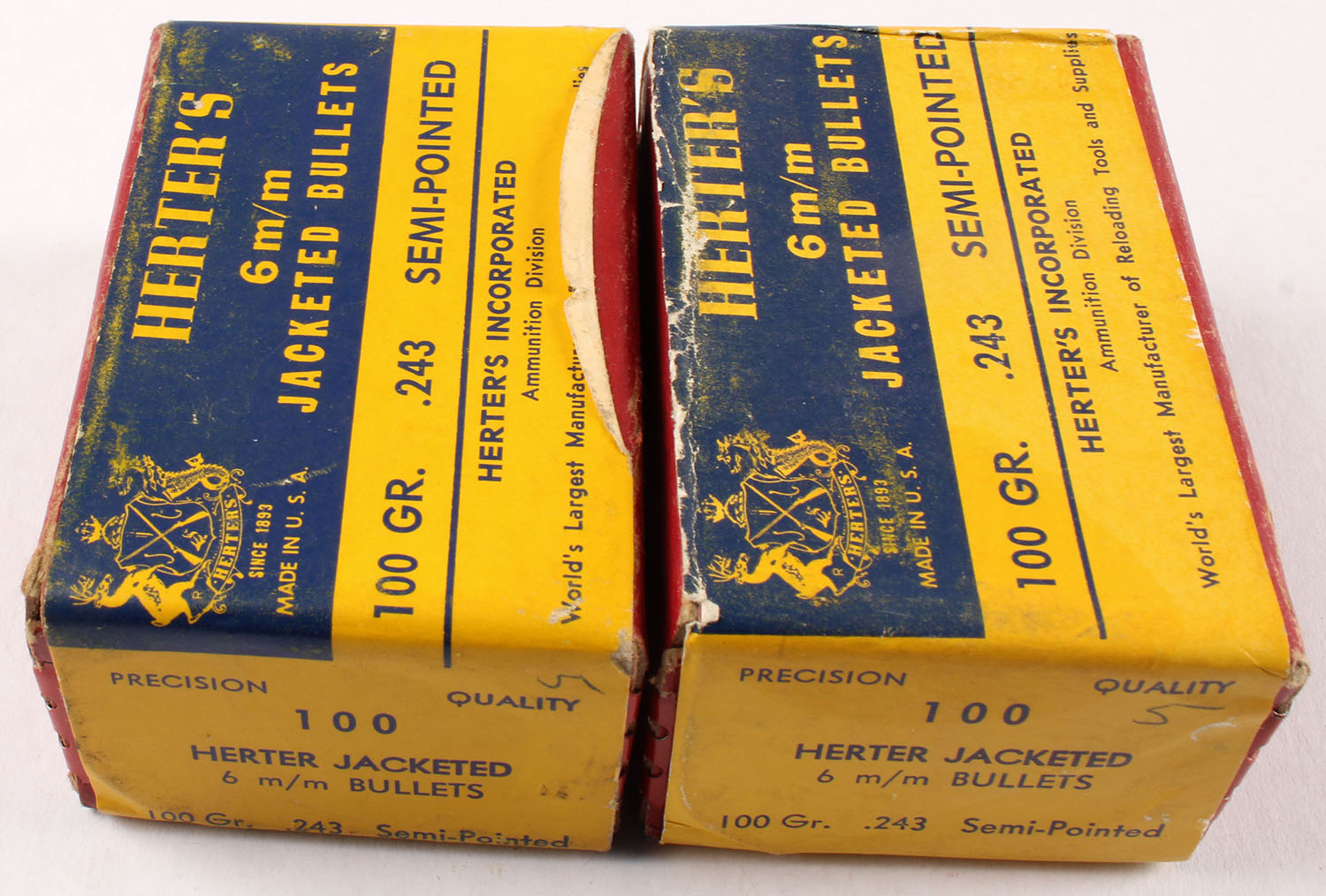 Herter's, Lot of 2, 6m/m Jacketed Bullets, 100 Gr., .243 Semi-Pointed, FULL & SEALED 200rds., 1pc. Red box with multi-color label, box is very solid with scuffing. Grade: Excellent - Value: 20 to 100