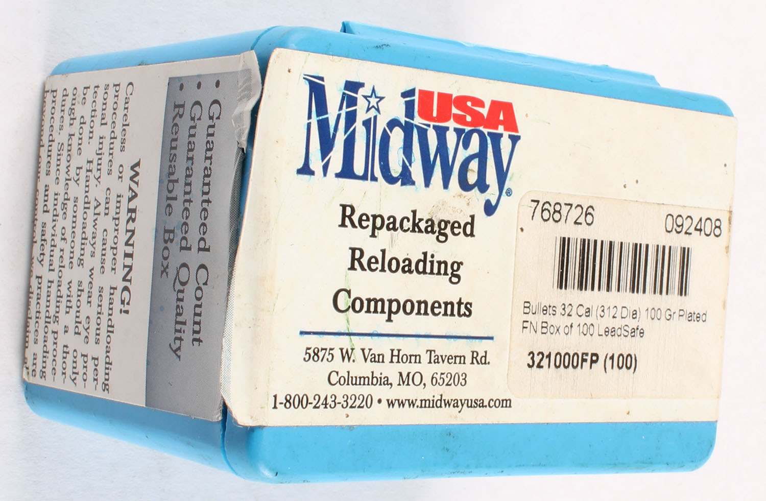 USA Midway, 32 Cal., 100 Grs. Plated, Appears 1/2 Full, 1pc., multi-colored box, box is solid with great colors, bullets are excellent. Grade: Very Good ++ - Value: 8 to 20