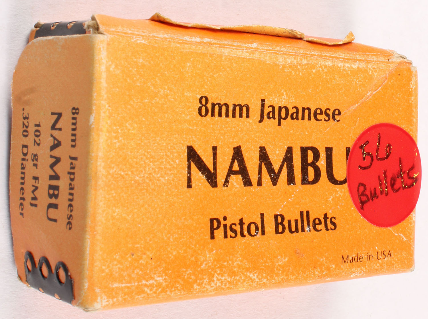 Nambu, 8mm Japanese, 102 Gr. FMJ, .320 Diameter, Partial 56 bullets, 1pc, multi-colored box, box is solid with great colors, bullets are excellent. Grade: Very Good - Value: 8 to 30