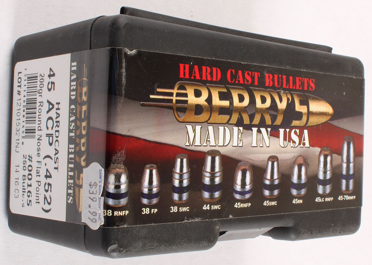 Berry's, Hardcast, .45 Long Colt, 200 Grain Round Nose Flat Point, .452 Dia., FULL & SEALED, 1pc. Black plastic box with multi-colored sealing label, box is MINT with minty color, label is intact. Grade: MINT - Value: 10 to 40