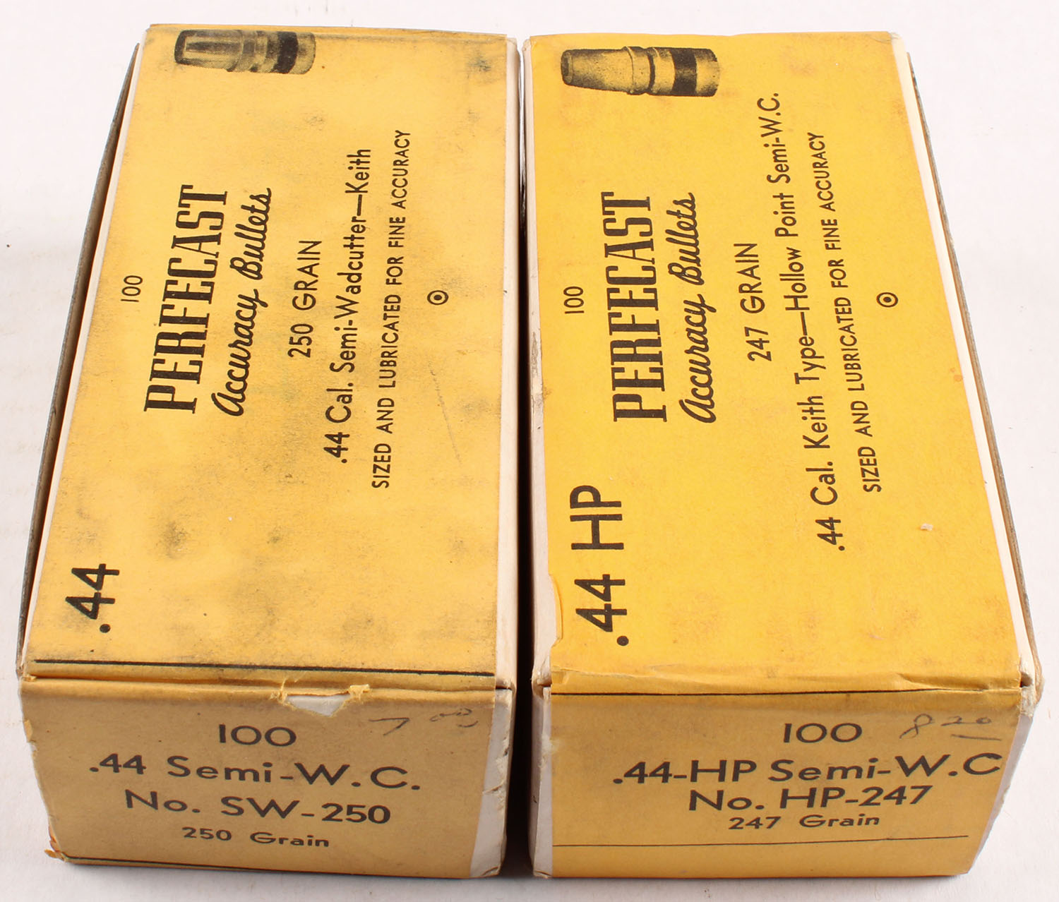 Perfecast Accuracy Bullets, Lot of 2, .44 Cal. Semi-Wadcutter, 247 Grain & 250 Grain, FULL & SEALED, 1pc., buff box with yellow label, box is solid. Grade: Excellent - Value: 20 to 60