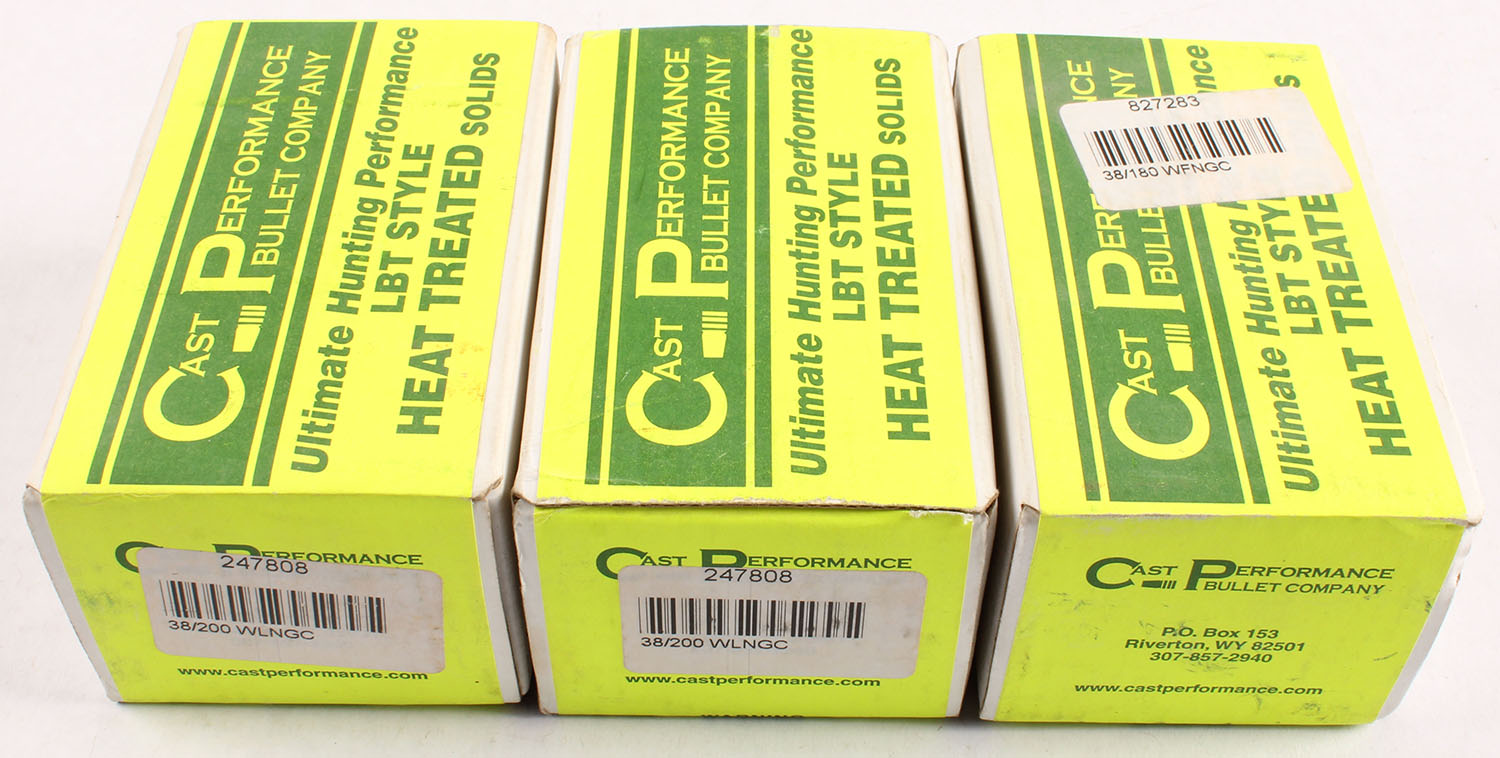 Cast Performance Bullet Company, Lot of 3, .38 Cal., 200 Gr., .358 Dia., FULL & SEALED, 1pc, multi-colored box, box is solid with great colors. Grade: Excellent - Value: 20 to 60