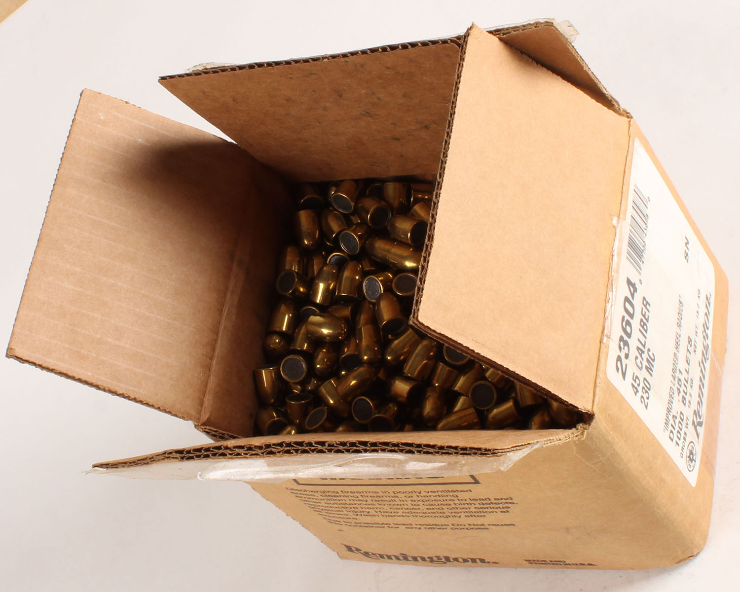 Case of Remington, .45 Caliber, 230 MC, .451 Diameter, 3/4 Full, 1pc, box is solid, bullets are minty. Grade: Excellent - Value: 30 to 100