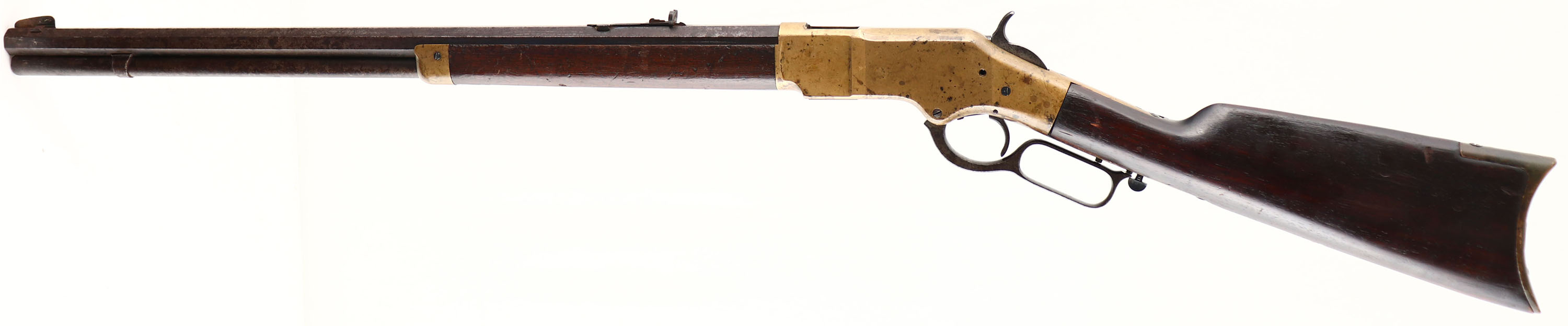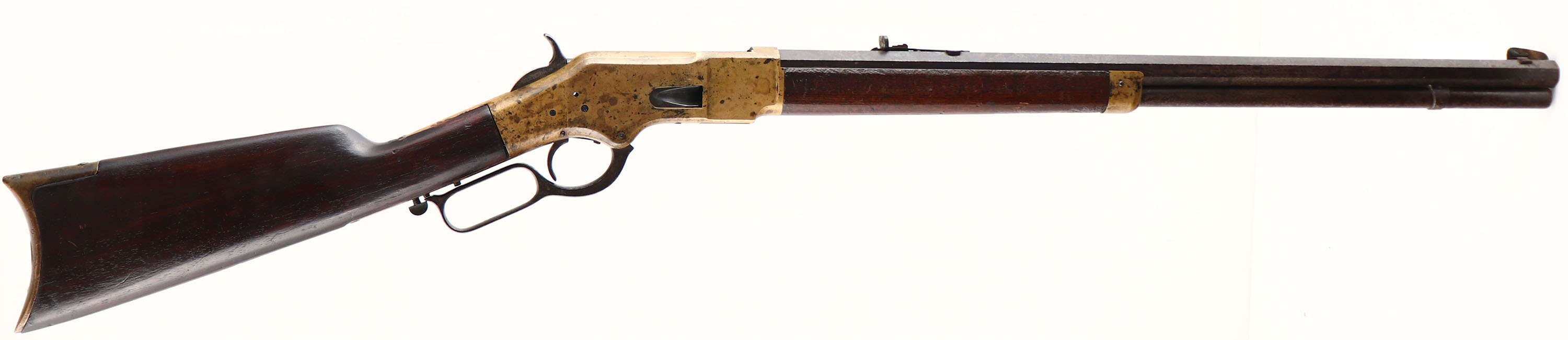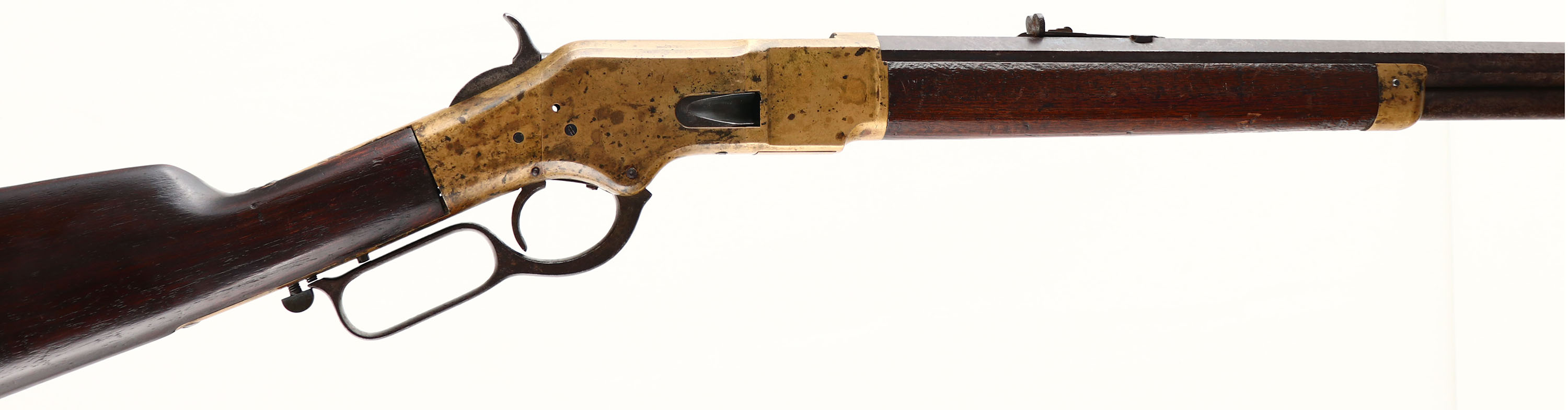 Winchester, Model 1866, Fourth Variation, .44 RF Cal., MFG. Antique, SN: 150009, Lever Action Rifle, 24 1/4'' Octagon barrel, Full mag. The wood stocks are good & solid, despite a few very short stress cracks at the wrist against the receiver & emanating from the ends of the tangs. There is also a tight 3'' hairline crack at the tip of the forend. The stock was sanded & refinished with a dark finish long ago. The forend appears to retain the original finish, although with loss do to use & wear. The stocks display numerous small nicks, gouges & contusions, & scratches, most of which is found on the forend. The metal finish on the barrel, mag tube, lever, forend cap & buttplate have fully toned to a spotty dark chocolate patina, with lost of light pitting or speckling thought. The brass receiver has a darker brown mustard tone, with black spots & staining. The receiver is missing a left sideplate screw & several other screws look like they are replacements. Bore is good, but with some pitting & roughness amongst solid rifling. Barrel mounted with an adjustable rear & a long brass blade front sight, with lead filling the space between the blade & the slot in the base of the sight. Rifle has the flip-up trapdoor crescent buttplate. Consistent with the 4th model, it has the italic SN stamped on the end of the lower tang. Lever locking lug is a replacement. This is a rustic survivor 1866, displaying all the character of authentic frontier use. Still a great antique brass rifle. Antique, No FFL Req. - Value: 2500 to 5000