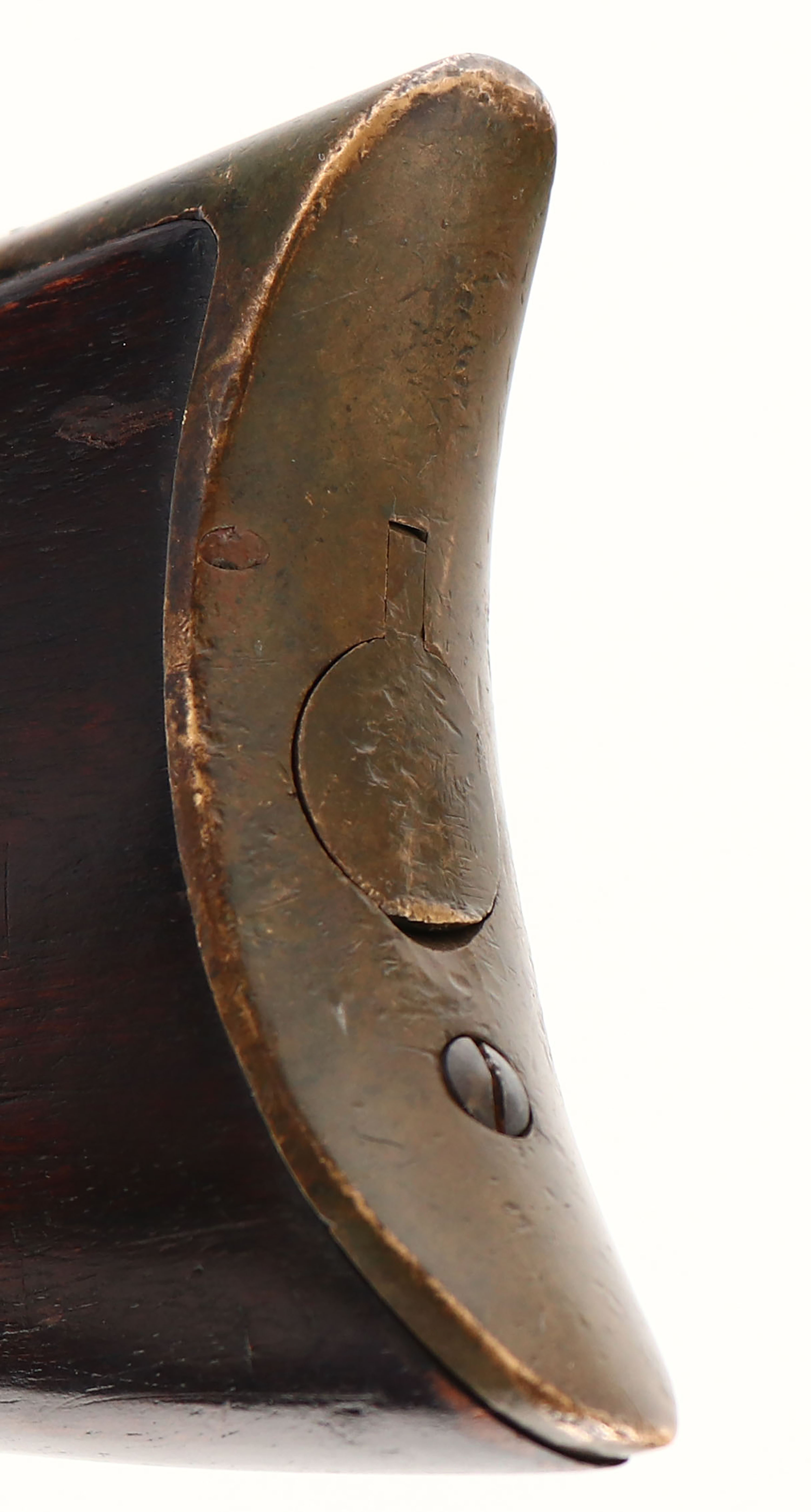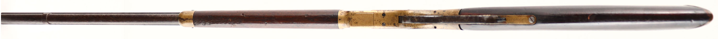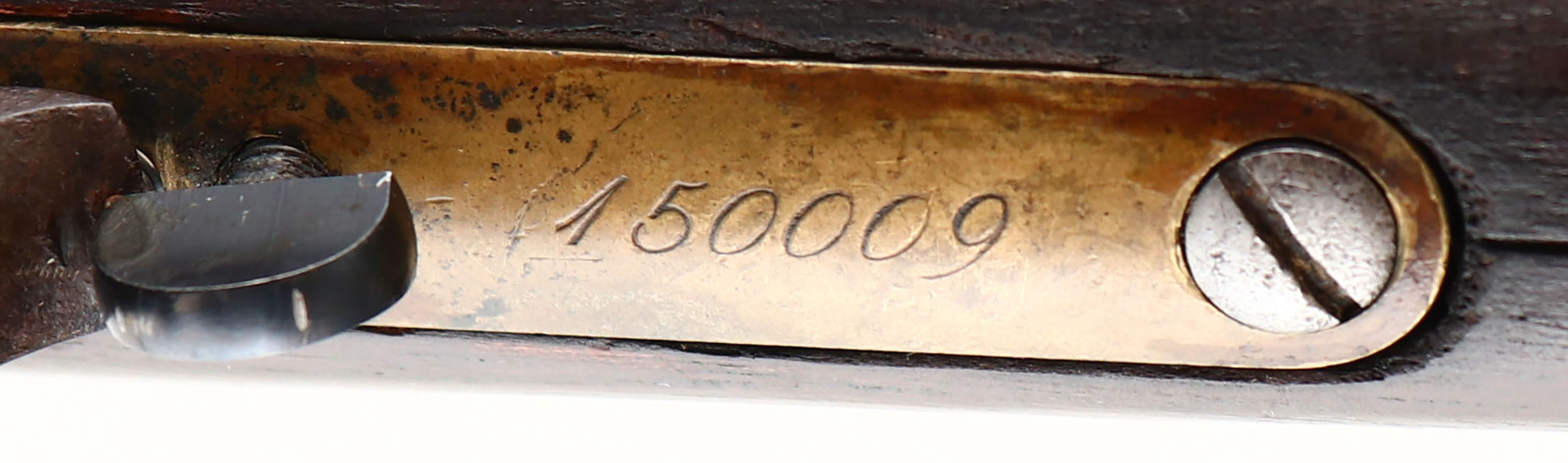 Winchester, Model 1866, Fourth Variation, .44 RF Cal., MFG. Antique, SN: 150009, Lever Action Rifle, 24 1/4'' Octagon barrel, Full mag. The wood stocks are good & solid, despite a few very short stress cracks at the wrist against the receiver & emanating from the ends of the tangs. There is also a tight 3'' hairline crack at the tip of the forend. The stock was sanded & refinished with a dark finish long ago. The forend appears to retain the original finish, although with loss do to use & wear. The stocks display numerous small nicks, gouges & contusions, & scratches, most of which is found on the forend. The metal finish on the barrel, mag tube, lever, forend cap & buttplate have fully toned to a spotty dark chocolate patina, with lost of light pitting or speckling thought. The brass receiver has a darker brown mustard tone, with black spots & staining. The receiver is missing a left sideplate screw & several other screws look like they are replacements. Bore is good, but with some pitting & roughness amongst solid rifling. Barrel mounted with an adjustable rear & a long brass blade front sight, with lead filling the space between the blade & the slot in the base of the sight. Rifle has the flip-up trapdoor crescent buttplate. Consistent with the 4th model, it has the italic SN stamped on the end of the lower tang. Lever locking lug is a replacement. This is a rustic survivor 1866, displaying all the character of authentic frontier use. Still a great antique brass rifle. Antique, No FFL Req. - Value: 2500 to 5000