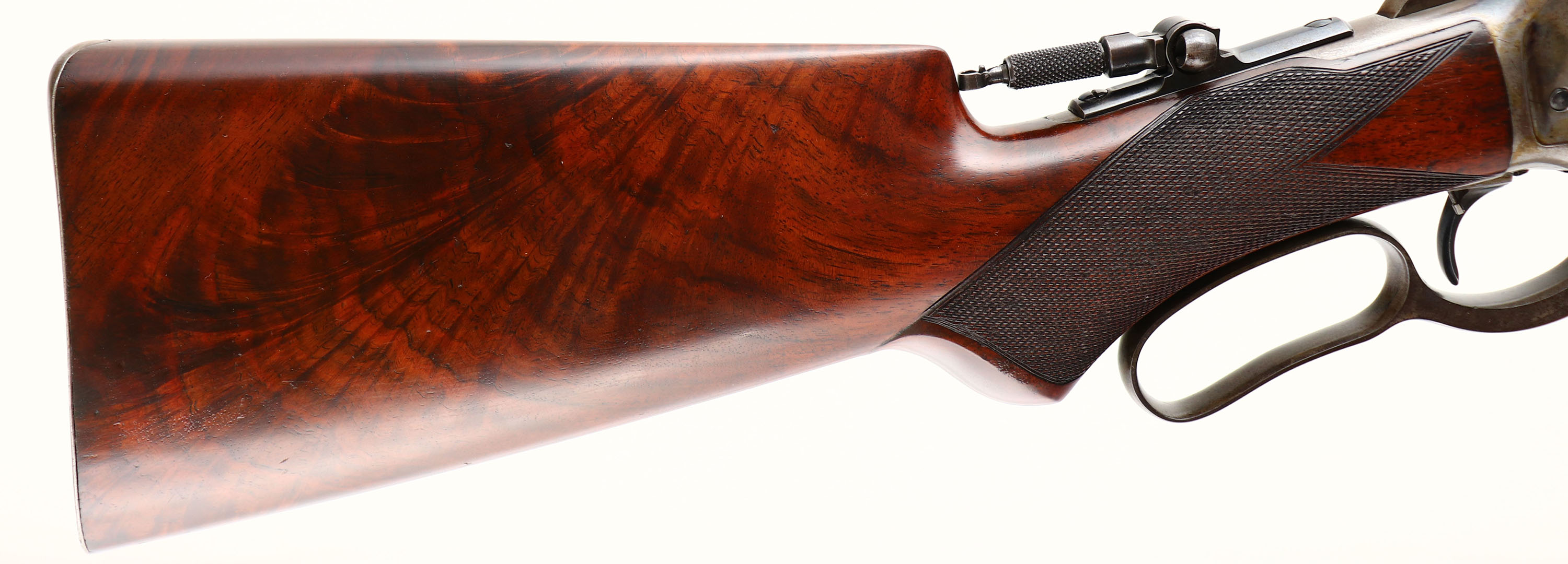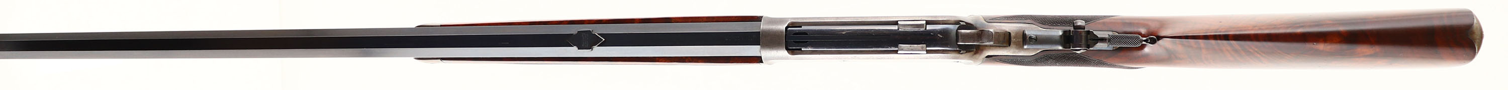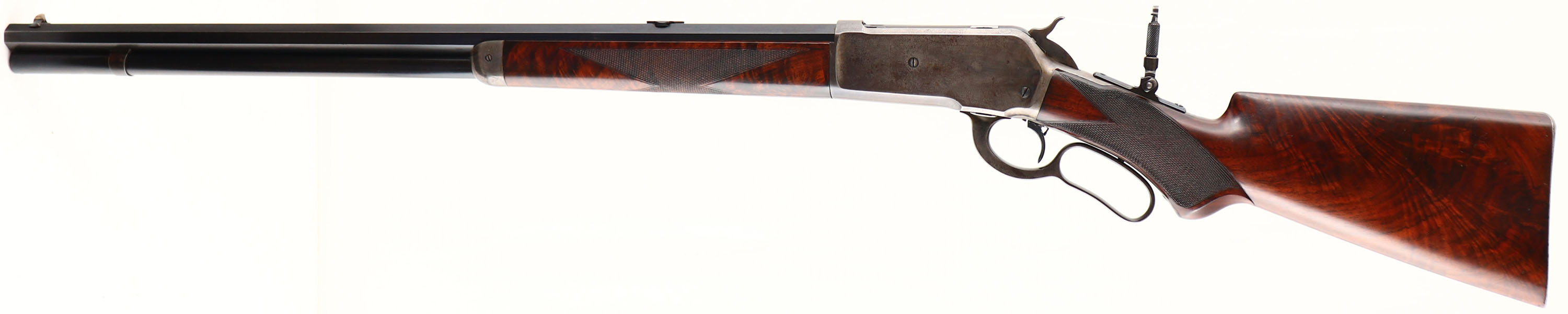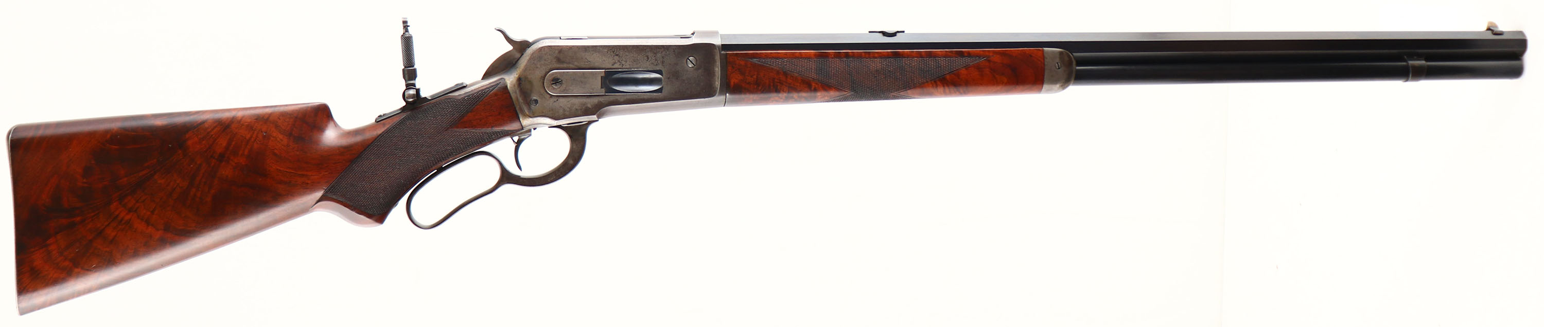 WONDERFUL Winchester, Model 1886 Deluxe, CAL: 40-82 WCF, MFG: 1891 (Antique), SN: 61664, Lever Action Rifle, 26'' Octagon barrel, Full mag. This Special Order Rifle has been partially & professionally restored. Mounted with fantastic, XX center crotch, rippled & feathered grain American walnut, with ''H'' style checkering. Serpentine pistol grip stock with the ebony inlay in the pistol grip & a Winchester metal widow's peak, shotgun style buttplate. The stocks are excellent, as professionally refinished. There are very few tiny handling marks remaining, with excellent original checkering. There is a tiny 1/8'' toe chip repair that presents well & flows nicely with the natural grain pattern. The professionally restored metal blue finish on the barrel & mag rates 98%, with some thinning of the original barrel stamps during barrel preparation. The restored blue matches original Winchester blue & is very well done. The sliding bolt retains a full 90% of the original bright blue, while the loading gate rates 95%. The receiver, lever, hammer, forend cap & buttplate are all case-hardened, having toned mostly gray, with outlines of old case-colors & some actual colors left in more protected areas of the receiver. The left side of the lower tang, under the wood, is stamped with the assembly number ''248'' & ''SXX'' for shotgun butt & XX grade wood. The upper tang channel in the stock is stamped with the same ''248'' assembly number. The underside of the buttplate is likewise stamped with the ''248'' & ''S'' for shotgun butt. The rifle is fitted with a Lyman tall stem flip-up tang sight, while the barrel carries a Marble's blank filled rear dovetail & original blade front sight. Bore is excellent. This Special Order deluxe rifle presents extremely well & remains very collectible as an early case-colored 1886.* Antique, No FFL Req. - Value: 7000 to 12000