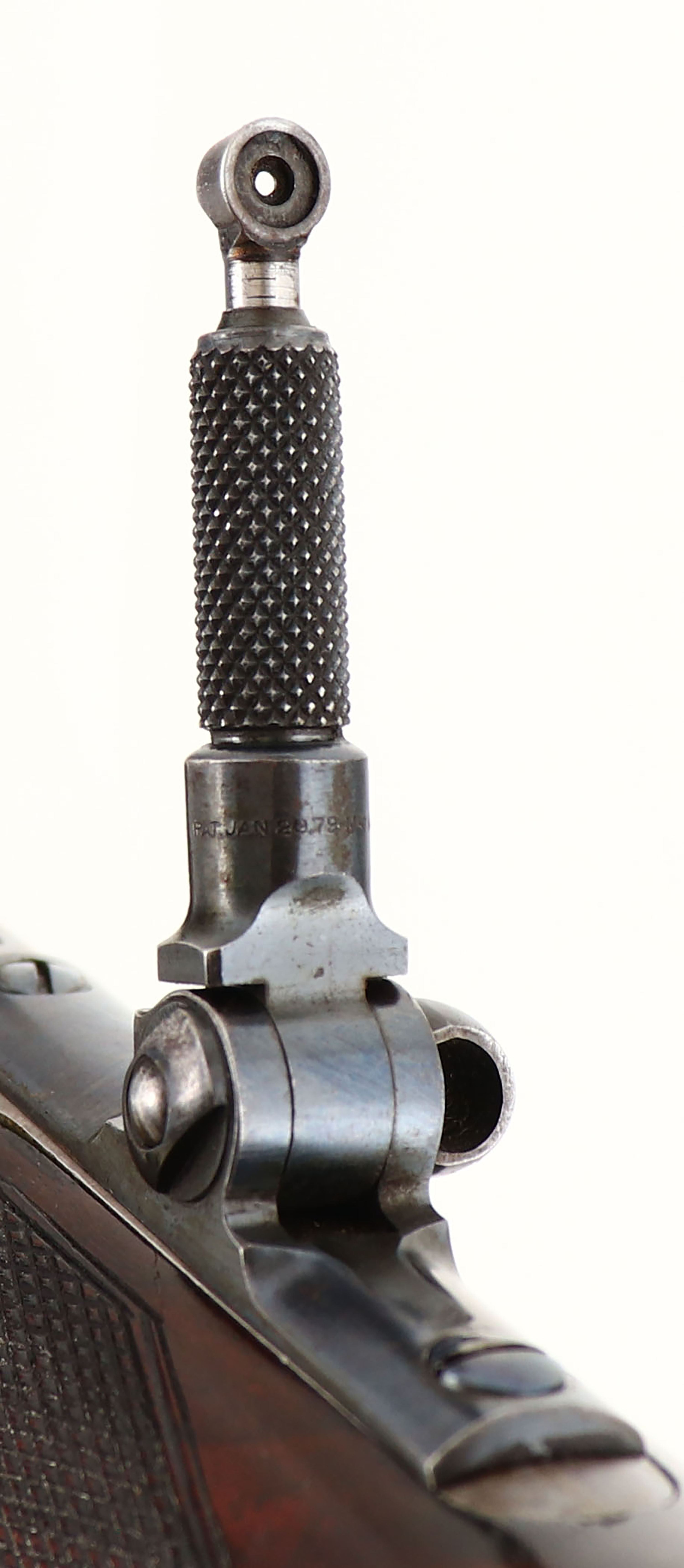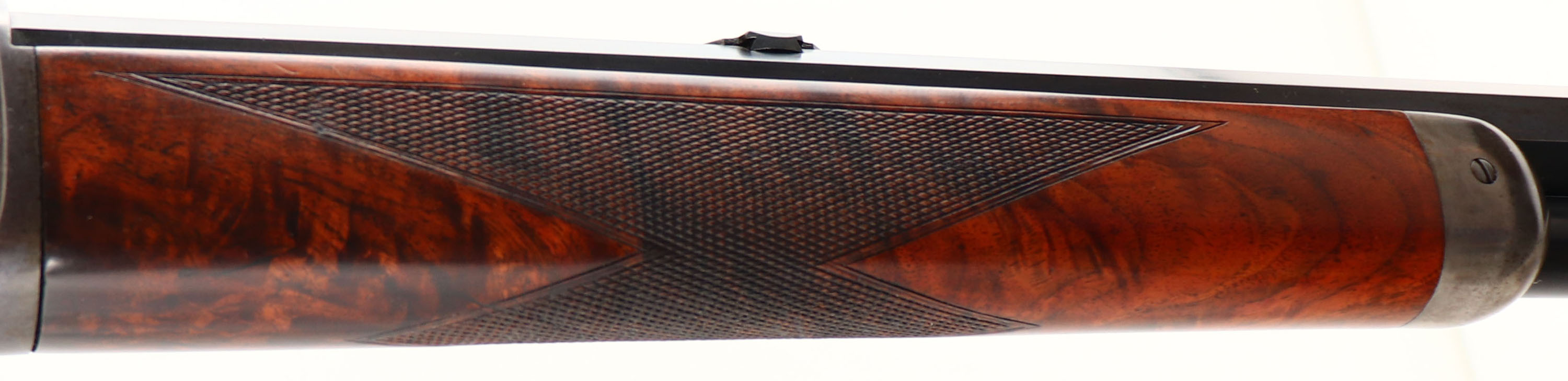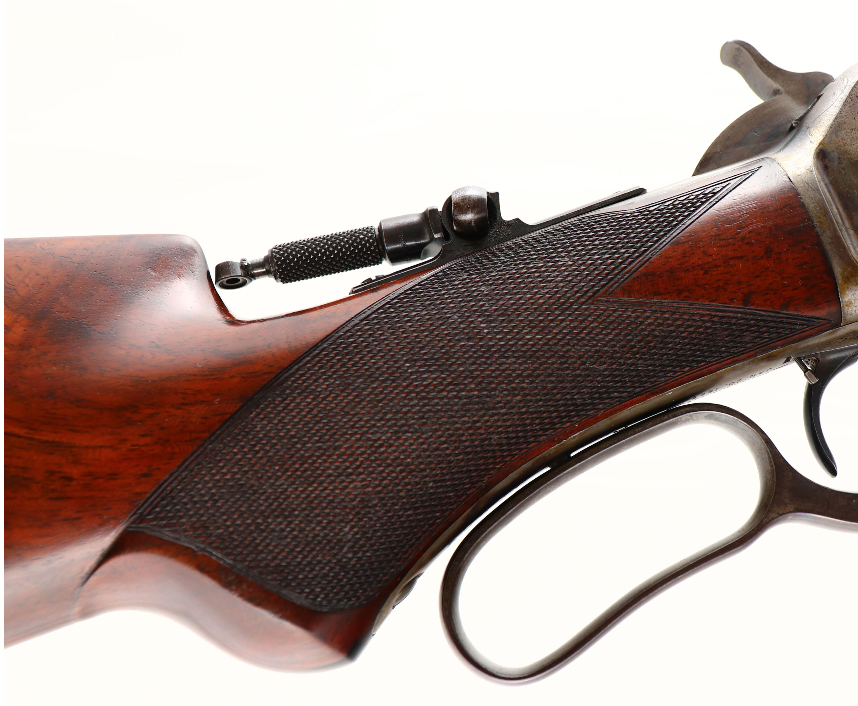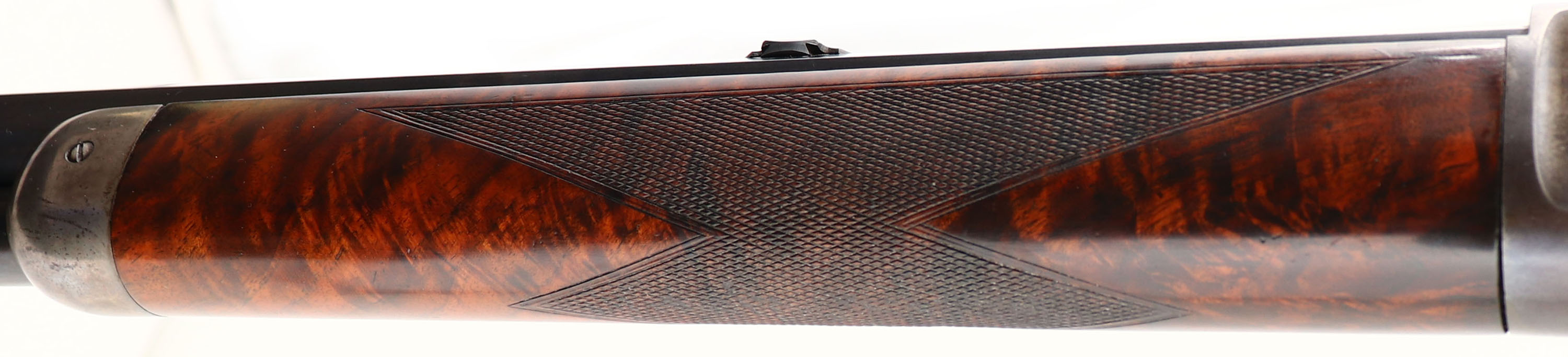 WONDERFUL Winchester, Model 1886 Deluxe, CAL: 40-82 WCF, MFG: 1891 (Antique), SN: 61664, Lever Action Rifle, 26'' Octagon barrel, Full mag. This Special Order Rifle has been partially & professionally restored. Mounted with fantastic, XX center crotch, rippled & feathered grain American walnut, with ''H'' style checkering. Serpentine pistol grip stock with the ebony inlay in the pistol grip & a Winchester metal widow's peak, shotgun style buttplate. The stocks are excellent, as professionally refinished. There are very few tiny handling marks remaining, with excellent original checkering. There is a tiny 1/8'' toe chip repair that presents well & flows nicely with the natural grain pattern. The professionally restored metal blue finish on the barrel & mag rates 98%, with some thinning of the original barrel stamps during barrel preparation. The restored blue matches original Winchester blue & is very well done. The sliding bolt retains a full 90% of the original bright blue, while the loading gate rates 95%. The receiver, lever, hammer, forend cap & buttplate are all case-hardened, having toned mostly gray, with outlines of old case-colors & some actual colors left in more protected areas of the receiver. The left side of the lower tang, under the wood, is stamped with the assembly number ''248'' & ''SXX'' for shotgun butt & XX grade wood. The upper tang channel in the stock is stamped with the same ''248'' assembly number. The underside of the buttplate is likewise stamped with the ''248'' & ''S'' for shotgun butt. The rifle is fitted with a Lyman tall stem flip-up tang sight, while the barrel carries a Marble's blank filled rear dovetail & original blade front sight. Bore is excellent. This Special Order deluxe rifle presents extremely well & remains very collectible as an early case-colored 1886.* Antique, No FFL Req. - Value: 7000 to 12000