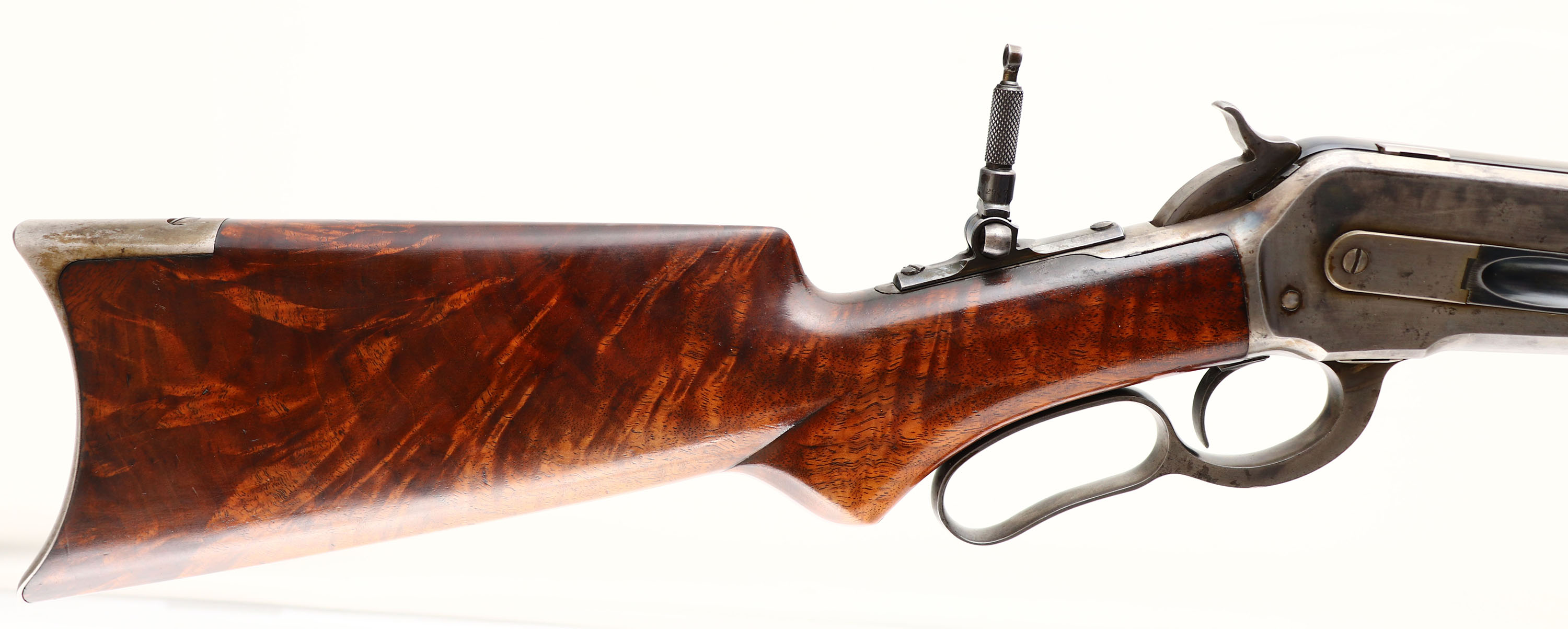 SPECIAL ORDER Winchester, Model 1886, 45-90 W.C.F., MFG. 1891, SN: 57985, Lever Action Rifle, SPECIAL ORDER 26'' EXTRA HEAVY Octagon barrel, Full mag. This rifle has been professionally restored. The fancy pistol grip stock, with ebony inlay, & forearm display fantastic flame & feathered grain. They appear to have their original finish, with a thin added layer on top for protection. The overall appearance is excellent, with very few tiny contusions or handling marks. The metal blue finish has been restored & rates 99% on barrel & mag. The case-hardened receiver has had some polishing done to it, but the receiver, lever & hammer still display muted outlines of the faded case-colors. The sliding bolt & loading gate retain a 90% of their original bright blue. The receiver is fitted with a Lyman tang sight, while the barrel carries an adjustable rear & small blade front sights. Bore is excellent. Stock carries a crescent metal buttplate. Comes with a Cody Winchester Factory Records Look-up sheet, which confirms special order configuration of the extra heavy octagon barrel & ''Fancy'' pistol grip stocks & production date. However, the caliber in the look-up sheet is listed as a 45-70, which is believed to be an error or legibility issue in the hand written records. There is two main reasons for this as the consigner indicates the underside the barrel also carries a ''45-90'' Winchester stamping & it has a bore twist rate of 1/32'' 45-90 bore instead of a 1/22'' 45-70 bore. Regardless of the caliber discrepancy, the rifle present extremely well & is very rare as an extra heavy weight barreled & non-checkered pistol grip deluxe antique rifle. An excellent special order & collectible 1886. FFL or C&R Req. - Value: 8000 to 15000