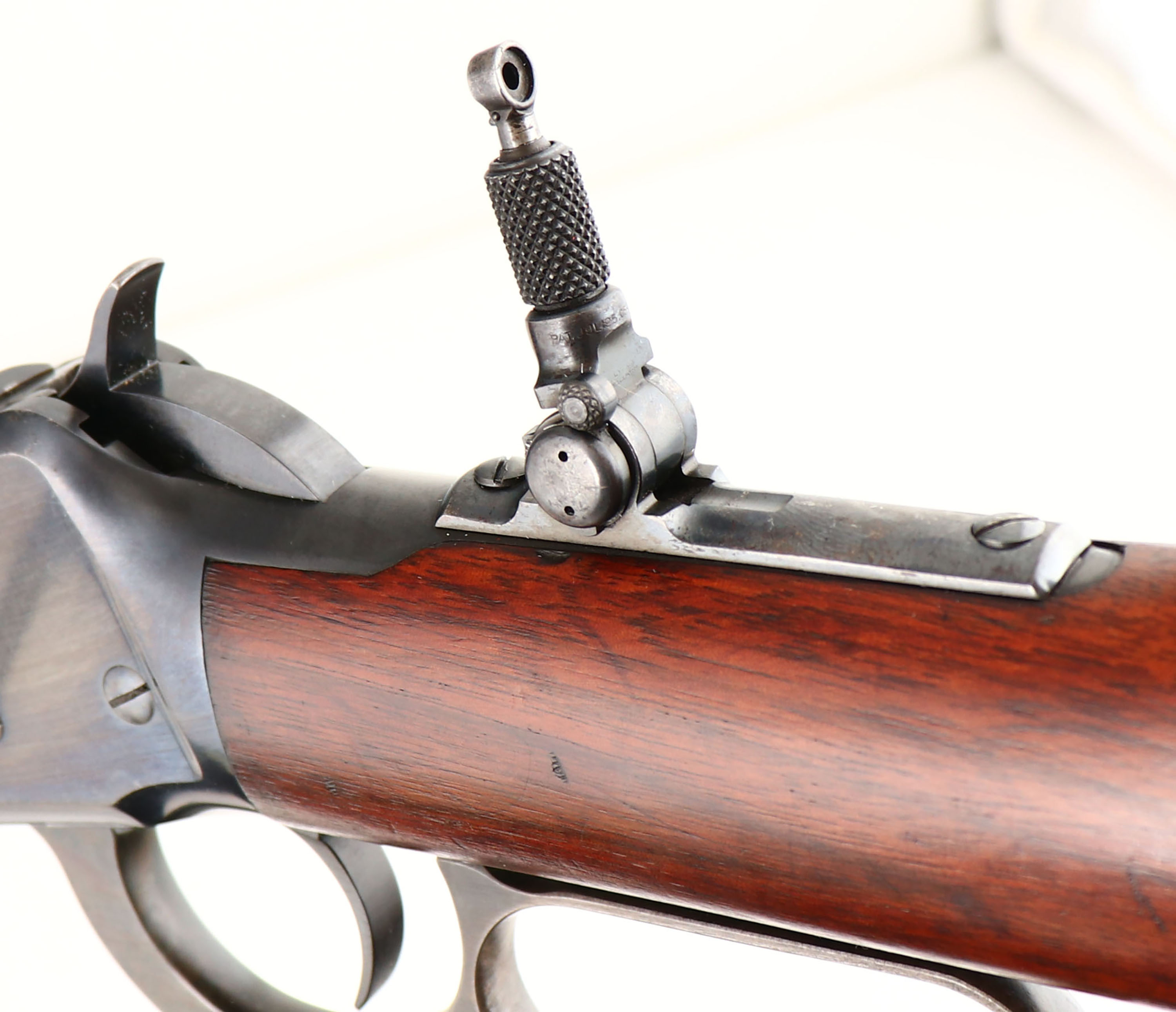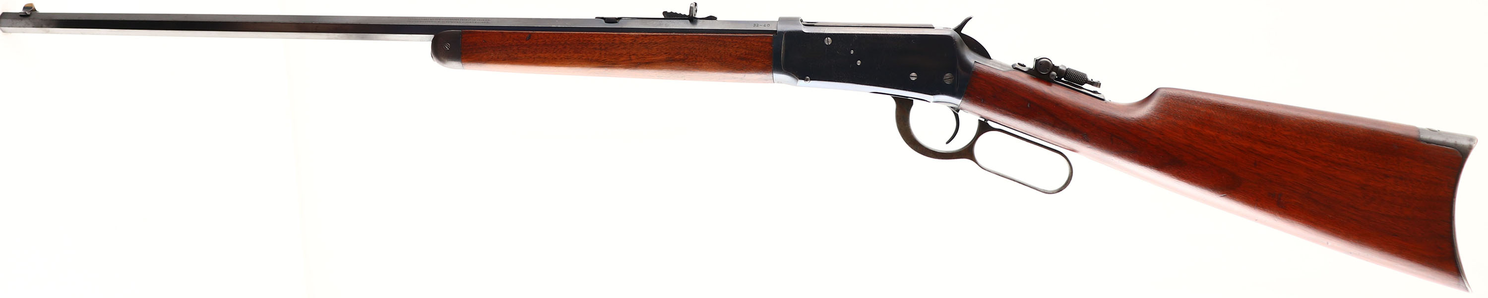 Winchester, Model 1894, CAL: 32-40, MFG: 1914, SN: 686030, Lever Action Rifle, 26'' Octagon Barrel, Button half mag. The original wood stocks are excellent, with a few light handling marks, scuffs & contusions to the original excellent finish. There is some thinning of the finish at the carry points. The original factory metal blue finish is 95% on the barrel, 90% on the receiver. There is an area of cleaned rust pitting along the barrel edges of the upper flat between the roll stamp & rear sight, not distracting to overall appearance. The case-hardened lever displays very nice case-colors. Bore is excellent. Rifle fitted with a Lyman tang peep sight, factory adjustable rear & pinch blade front sights. Metal crescent buttplate. Tight smooth action. An overall excellent original condition rifle & very collectible in one of the rarer calibers & as a button mag. FFL or C&R Req. - Value: 4500 to 6000