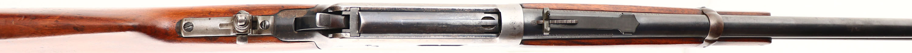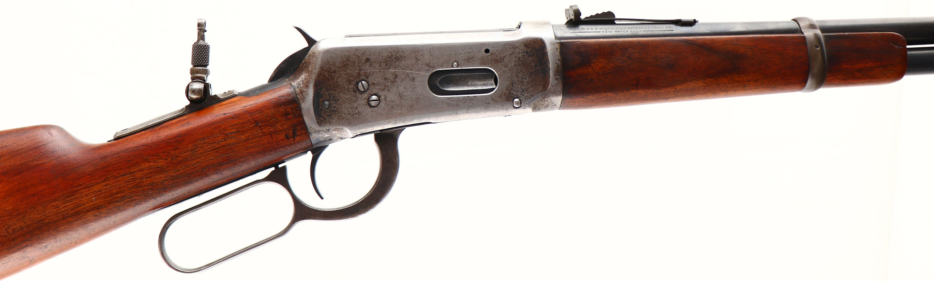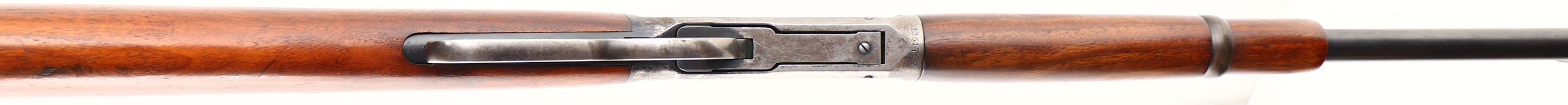 RARE Winchester, Model 94 15'' TRAPPER CARBINE, CAL: 30-30 WCF, MFG: 1929, SN: 1051727, Lever Action Carbine, 15'' Round barrel, Full mag. The included factory letter indicates only that the SN was applied on July 25, 1929. Also included is a copy of the ATF C&R exemption log showing the carbine is a 15'' barrel gun, which is exempt & legal for you to own. The smooth walnut straight grip wood stock & forend are excellent, with the expected scattered light dings & minor handling marks, otherwise retaining a very nice overall fit. The forend is the correct shorter 8'' length. The metal blue finish rates 85% on barrel & mag, while the receiver has worn mostly gun metal gray, with a thin sprinkling of brown patina & spots of original blue in the most protected areas. Bore is unusually excellent for these trappers & way above average. The loading gate & bolt retain much of the original blue. The carbine is fitted with a Lyman tang peep sight, while the barrel carries a replacement adjustable rear & a carbine box & blade front sights. Buttstock carries a smooth carbine metal buttplate. All markings remain intact & strong. The action is tight & smooth & appears to function well mechanically. An excellent example & very collectible as a rare & legal 15'' trapper. FFL or C&R Req. - Value: 10000 to 15000