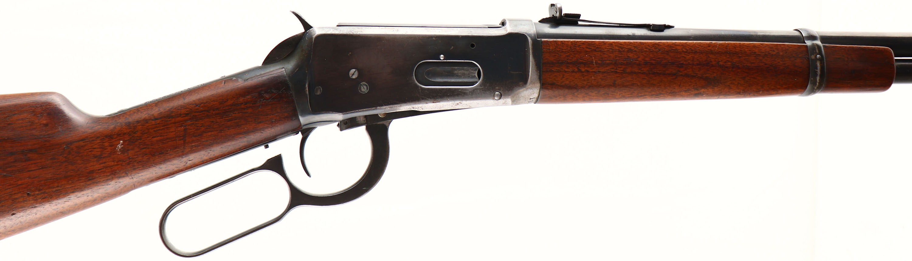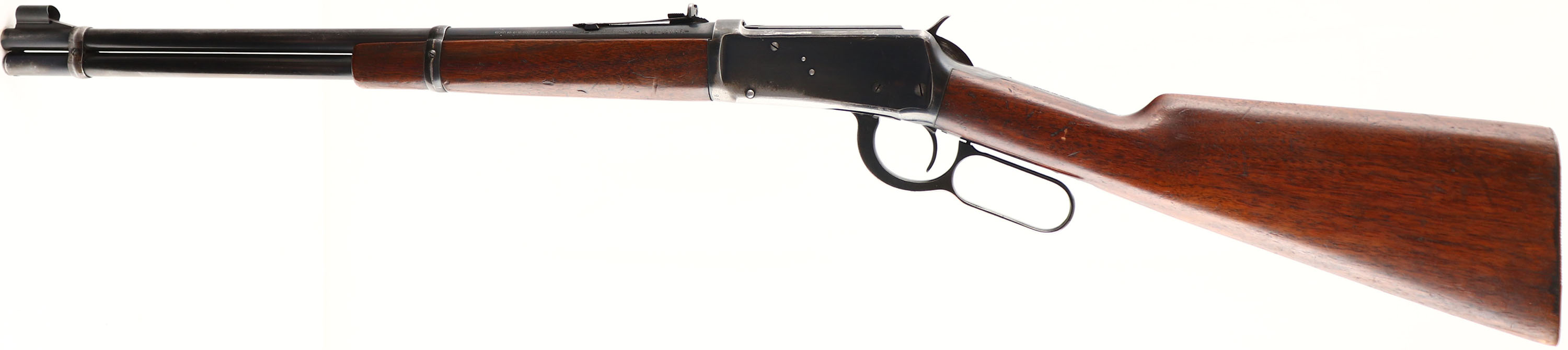Winchester, Model 94 Eastern Carbine, marked 30 W.C.F. Cal., MFG: 1942, SN: 1316596, Lever Action Carbine, 20'' Round barrel, Full mag., The original wood stocks are very good & solid, with minor handling marks & contusions to the original finish which is thinning with wear. The original factory blue finish rates 90% on the barrel & mag tube, 70% on the receive. The barrel carries an adjustable rear sight & ramped hooded front sight. Bore is very good. The stock carries the original serrated shotgun style metal buttplate. An original & nice 94 carbine. FFL & C&R Req. - Value: 1200 to 2500
