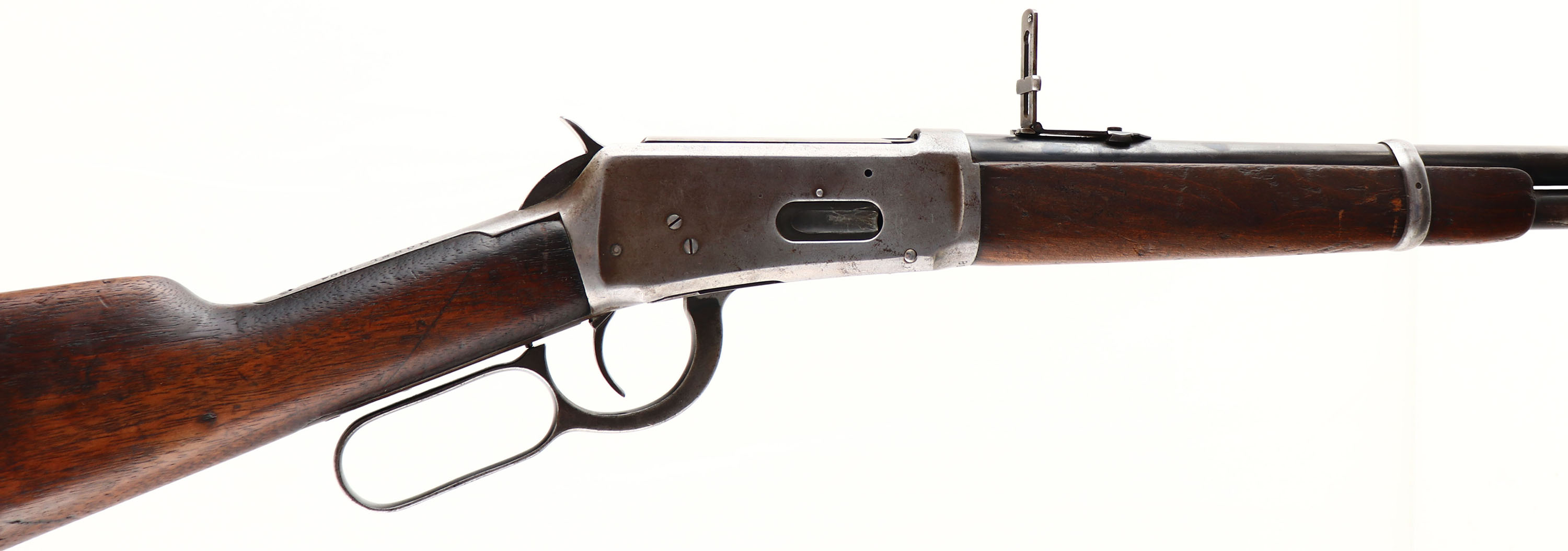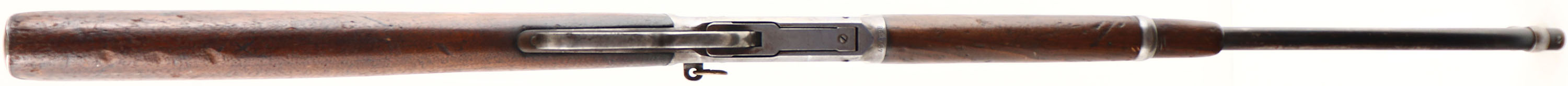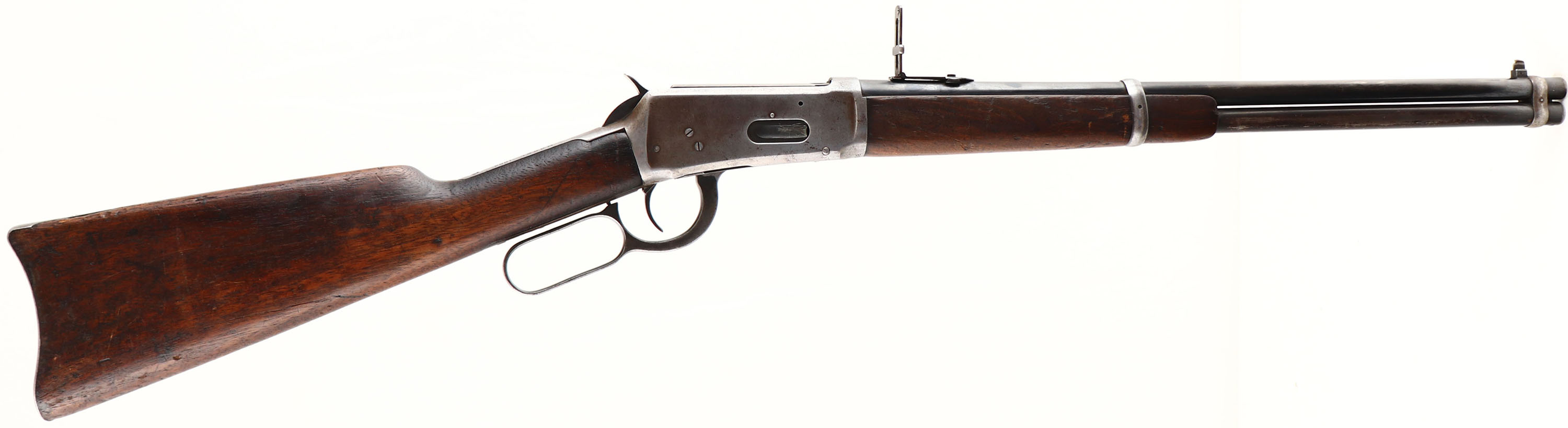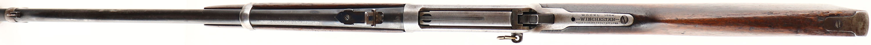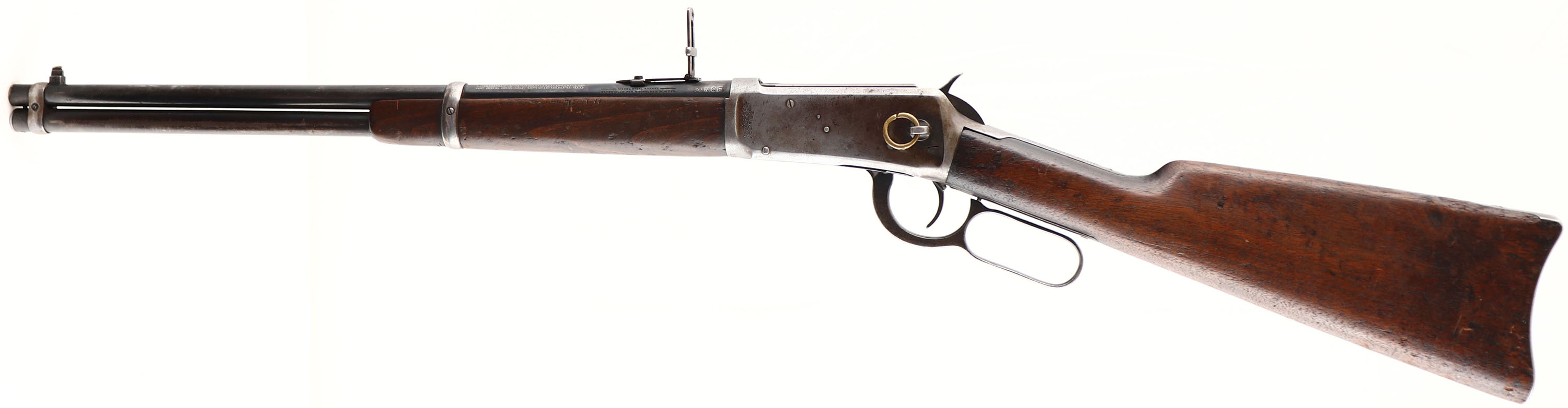 Winchester, Model 1894 SRC, marked 30 W.C.F. Cal., MFG: 1915, SN: 801767, Lever Action Carbine, 20'' Round barrel, Full mag., The original wood stocks are very good & solid, but with numerous small scratches, scrapes, nicks & contusions. The wood carries the original finish, which is worn thin from use. The original factory blue finish rates 60% on the barrel, 40% on the mag tube, while the receive has worn gray. The left side of the receiver has an area of lots of stippled abrasions. The barrel carries carbine ladder rear & box blade front sight. Bore is very good. The stock carries a carbine metal buttplate. The original saddle ring is missing & a smaller brass ring has been added. The upper tang is missing one of the filler screws. A well used, but very usable SRC. FFL & C&R Req. - Value: 500 to 1000
