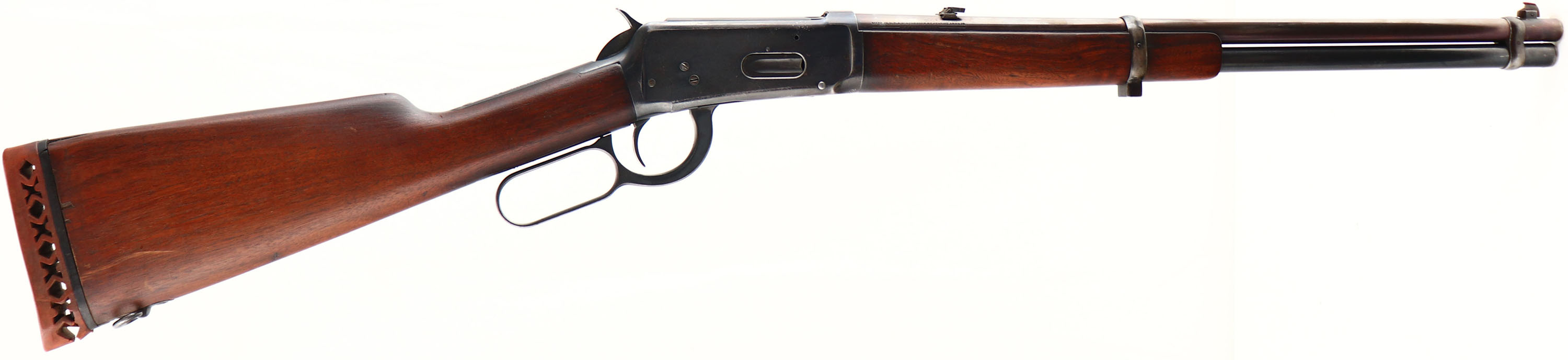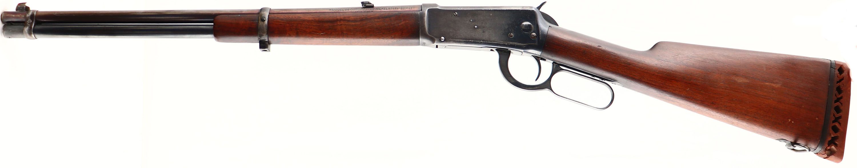 Winchester, Model 94 SRC, marked 30 W.C.F. Cal., MFG: 1926, SN: 988526, Lever Action Carbine, 20'' Round barrel, Full mag., The original wood stocks are good & solid, as sanded & refinished. The stock has been cut & carries a worn out ventilated recoil pad. There a very few handling marks or contusions remain. The metal was reblued long ago as indicated by wear loss. The receiver & mag carry 60% blue, while the blue on the barrel has worn mostly gray, with s slight plum tone. The left side of the receiver has an area of lots of stippled abrasions. The barrel carries a folding leaf rear sight, which has lost it's spring, & box front sight, with replaced blade. The upper tang has two open holes where a tang sight once resided. Bore is very good. The saddle ring has been removed & the lug ground down prior to the rebluing process. The stock carries a sling loop, while the front barrel band had a sling provision added, but is missing the loop. The carbine appears to function well, but could use a bit of work & parts to improve the overall aesthetic. FFL & C&R Req. - Value: 300 to 500