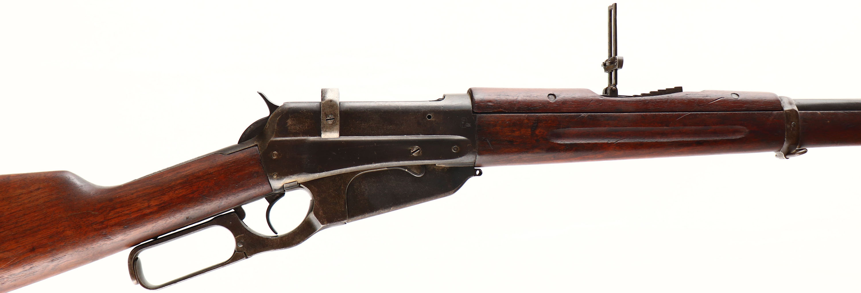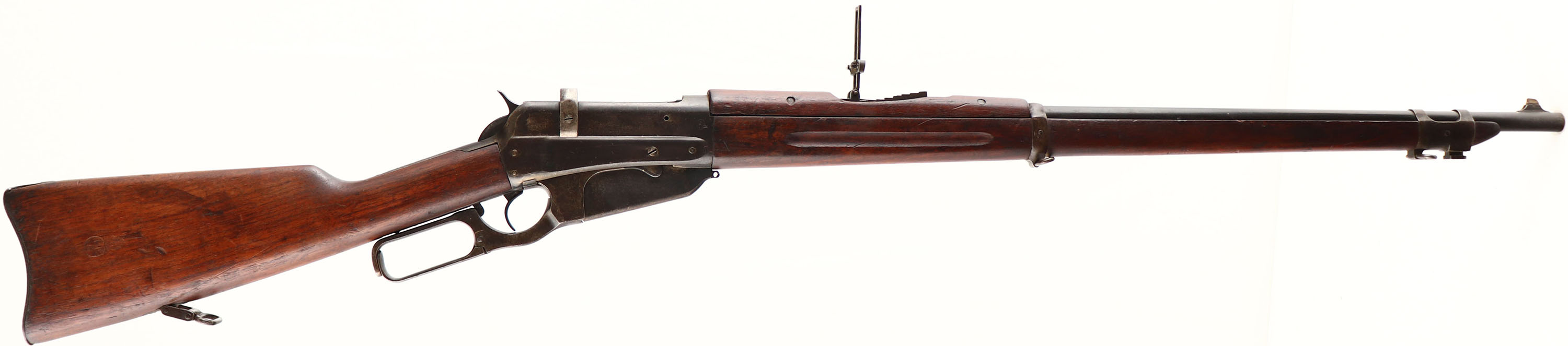 Winchester Model 1895, Russian Contract, CAL: 7.62x54R, MFG: 1916, SN: 270301, Lever Action Rifle, 28'' barrel. Between 1915 & 1917 Winchester manufactured approximately 300,000 Model 1895 chambered for the Russian 7.62x54R cartridge & equipped with stripper clip guide ears. The frame at the breech is marked with the WP proof & ''7.62/M.M.'', right side of receiver is stamped with Russian proof/acceptance mark, while the left side is marked with the two line address & patent information, ''MANUFACTURED BY THE WINCHESTER REPEATING ARMS CO. NEW HAVEN CONN. U.S.A. PATENTED NOV. 5. 95. AUG. 17. 97. JAN. 25. 98. AUG. 23. 98. AUG 6. 1907.''. The upper tang has the model & trademark information, ang marked, ''Model 1892 Winchester Trade Mark REG. IN U.S. PAT. OFF. & FGN.''. During the Spanish Civil War (1936-1939), Russia supported the Spanish Republican Government in their battle against General Francos Nationalist Army. In return for large quantities of gold coins & bullion from the Spanish treasury, Russia shipped immense amounts of armaments to Spain, among which were almost half a million small arms. One of the shipping documents lists 9,000 Winchester Model 1895 Muskets. After Francos Nationalist forces prevailed, a ''National Ordnance Recovery Unit'' was commissioned to survey, sort, clean, or refurbish all captured or surrendered armament. The acceptance mark of this inspection is the ''MP 8'' flaming bomb stamped on the buttstock of each rifle. This particular rifle carries the ''MP 8'' flaming bomb stamp on the right side of stock & is one of these captured rifles sent by Russia to the Spanish Civil War. The rifle features the nearly full length military style forearm, with grasping grooves & military type handguard, & straight wrist stock. The walnut stocks are very good & solid, displaying numerous scrapes, nicks & contusions to the original finish. The original metal blue finish rates 70% overall, with areas of loss toning to a gray/brown patina. The SN & ''B'' are stamped across the lower tang behind the trigger. Bore is very good. Barrel holds a pinned Sheard blade/bead front sight & folding ladder rear sight graduated 15-32 on the ladder & 6-14 on the stepped base. The front band has a bayonet lug & sling loop, while a second loop is mounted to the rear strap. The magazine has a sling loop lug with no swivel, while the buttstock has the sling provision, with original sling loop. Buttstock carries the original smooth metal sliding trapdoor buttplate. A very nice piece of history involving both the Russians & Spaniards, & two wars. FFL or C&R Req. - Value: 1500 to 3000
