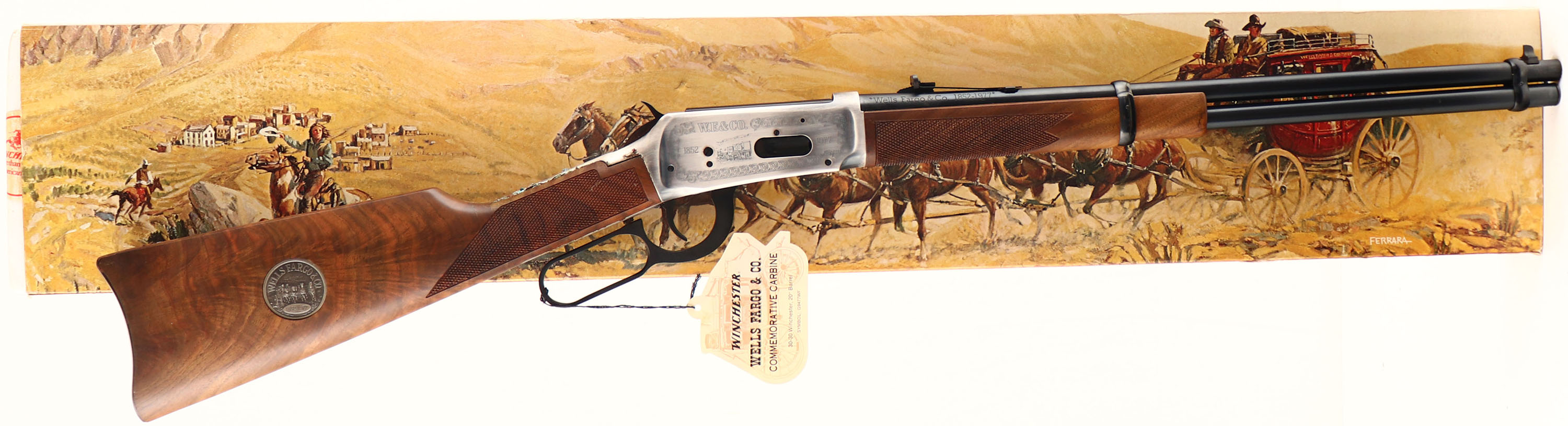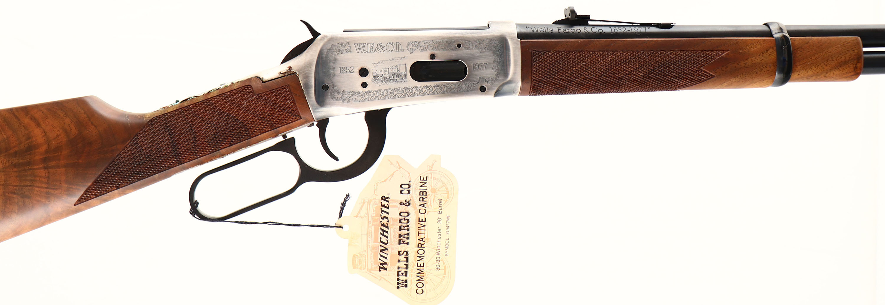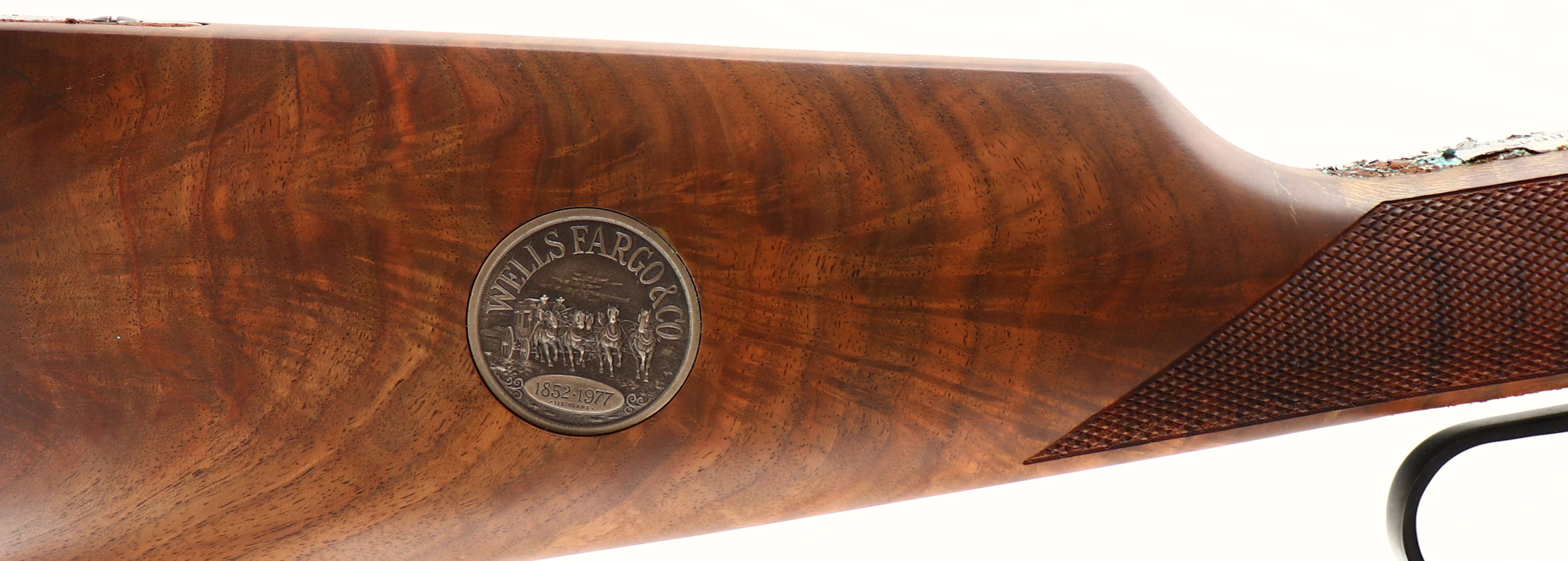 BOXED Winchester Model 94 Wells Fargo & Co. Commemorative, CAL: 30-30, MFG: 1977, SN: WFC311, Lever Action Rifle, 20'' barrel. The left side of the receiver displays an intricate engraving of a Wells Fargo Stage Coach being pulled by horses, bordered by an ornamental pattern & on the right, '' W.F.& CO. 1852'', an image of a W.F. storefront, 1977'' bordered by an ornamental pattern. The checkered, straight grip wood stocks are excellent, with very few tiny handling marks. The stock displays fabulous rippled & feathered grain & includes an inlaid silver W.F. medallion. The metal blue finish rates 98%, with a couple small area of spotting on barrel. The rifle was stored in it's factory box since original purchase, but not always with proper temperture controls & it did cause heavy rust pitting & corosion on the upper & lower tangs & buttplate. The rest of the polished coin silver receiver is excellent, with some light thin surface scratches. Bore is excellent. Factory sights. Buttstock carries a smooth metal buttplate, with rust. Comes in its original box, with hang tag. A beautiful commemorative saddle ring carbine that will need some work to clean-up or repair metal damage on tangs. Only 19,999 produced. FFL or C&R Req' - Value: 400 to 800