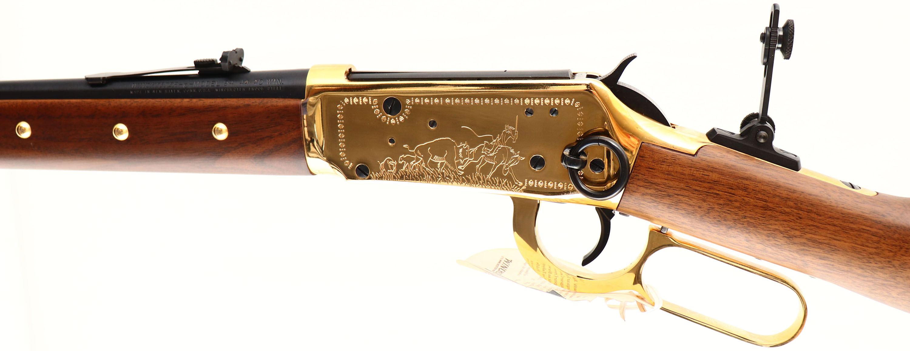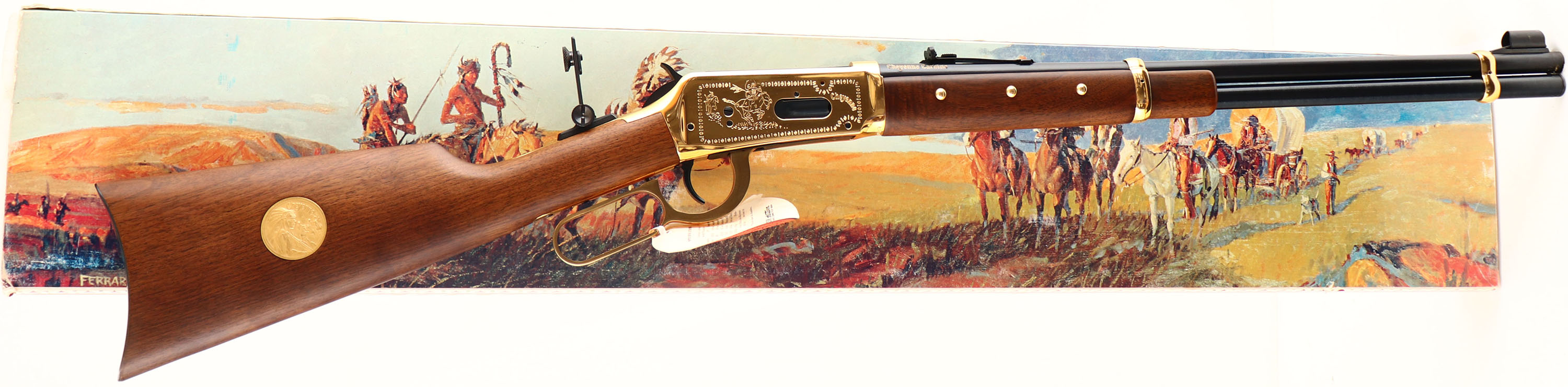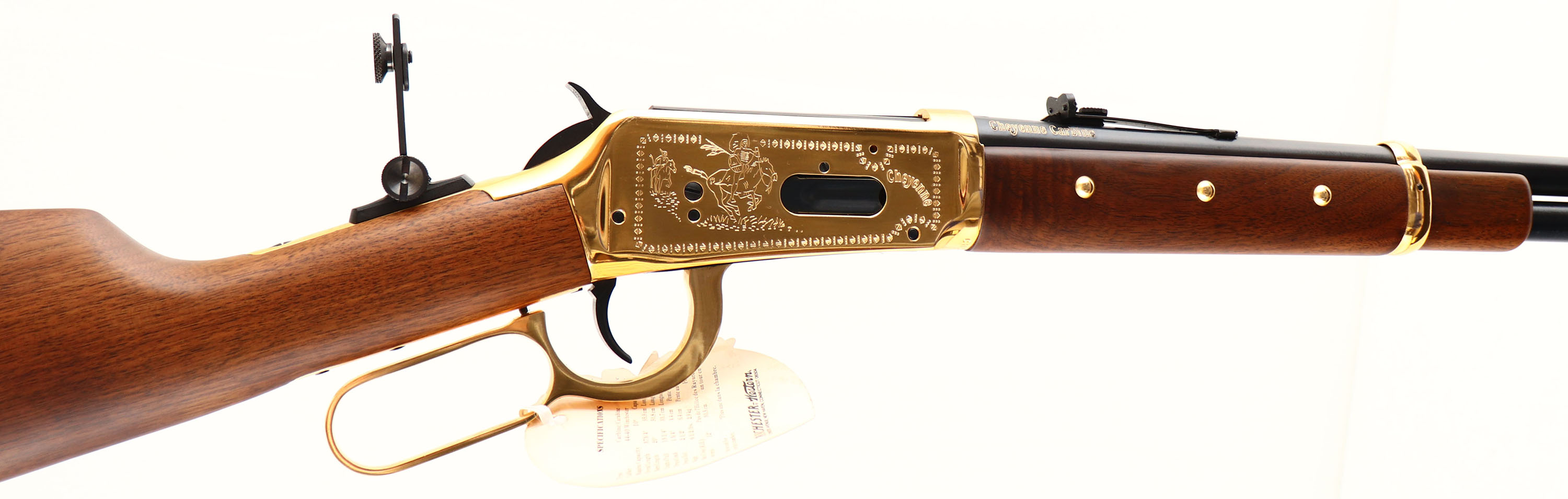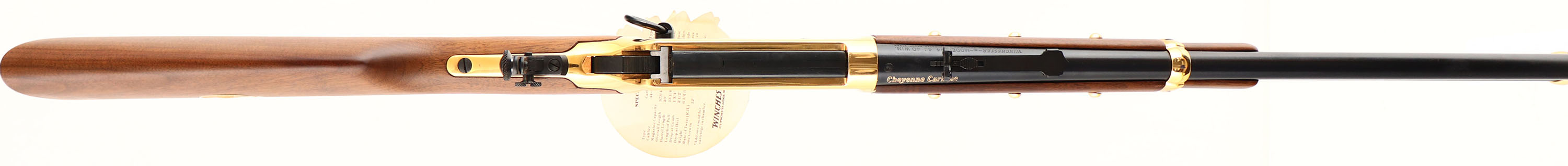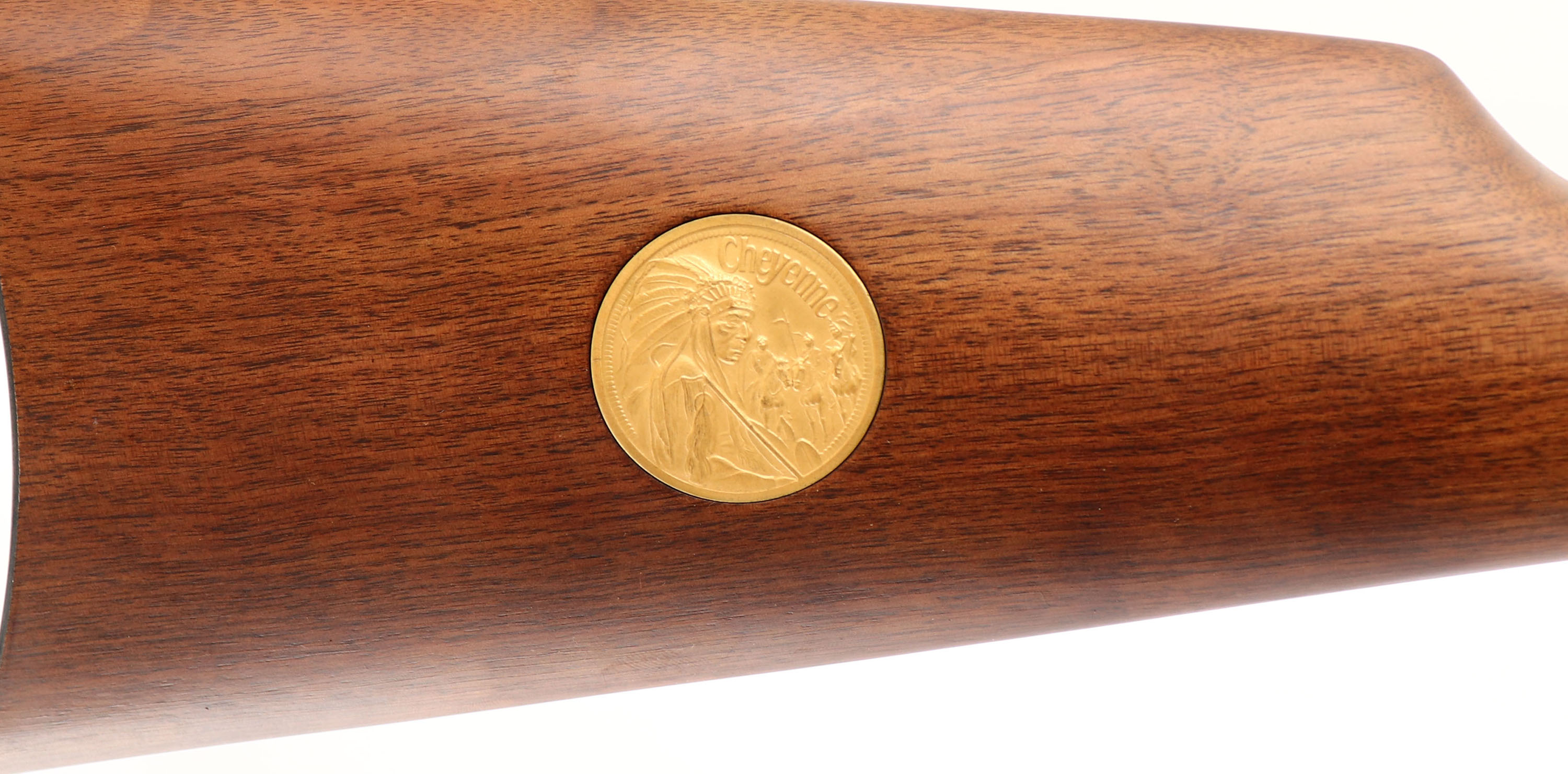 BOXED Winchester, Model 94 Cheyenne Carbine, 44-40 WIN Cal., MFG. 1977, SN: CH01264, Lever Action, 20'' barrel. In 1977 Winchester produced 11,220 of these Commemorative Cheyenne Carbines. The gold washed receiver is engraved on both sides with vignettes that celebrate the ''Great Plains Cheyenne's''. The handsome straight grip walnut stocks carry gold washed tacks in the forend & a gold tone Cheyenne medallion inlayed into the right side of the stock. The stock & the factory finish are basically mint. The gold tone receiver, lever & barrel bands are excellent. The original metal blue is 99.9%. Bore is mint. The rifle is fitted with a sliding aperture adjusting tang sight, while the barrel carries the original adjustable rear & hooded blade front sights. The stock carries a blued crescent metal buttplate. Comes in the original numbers matching styro box, with sleeve, wax paper, hanging tag & paper work. Sleeve is excellent. Another excellent Winchester collectible. FFL or C&R Req. - Value: 1000 to 2000