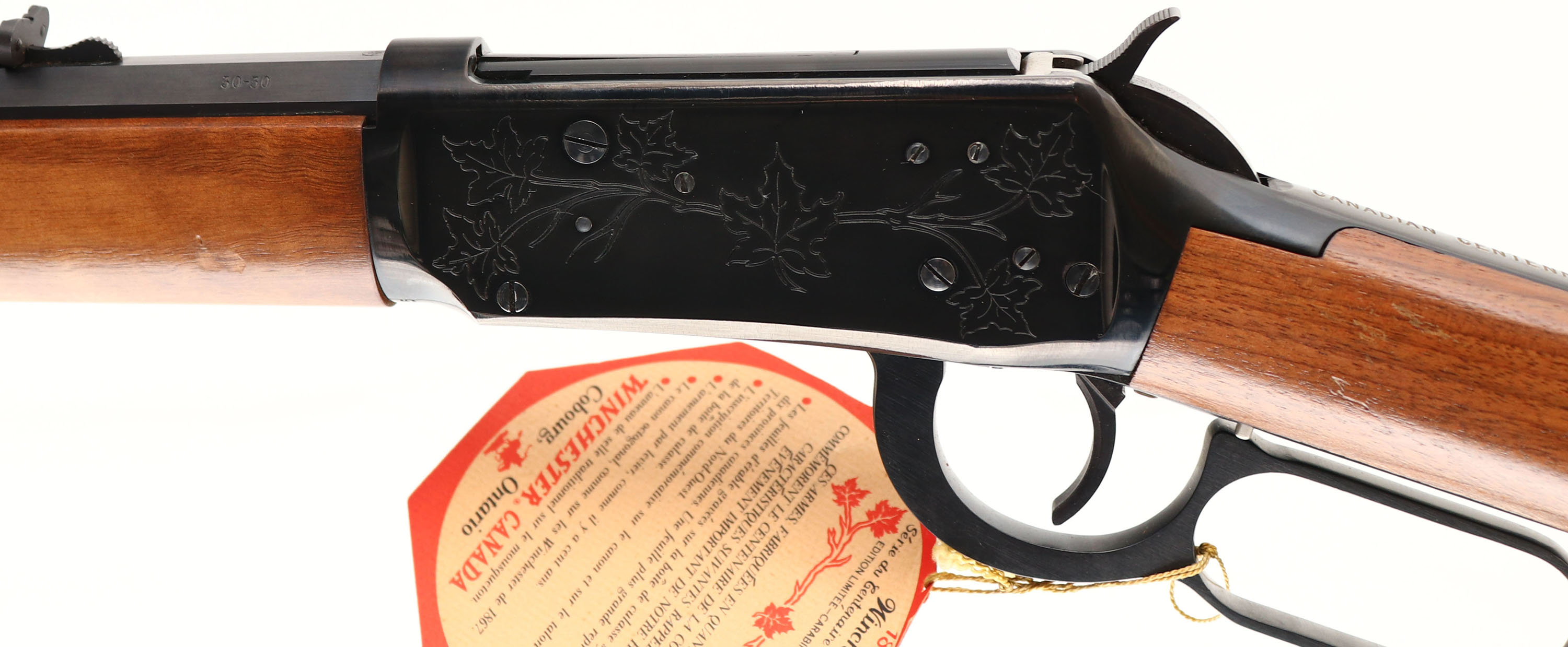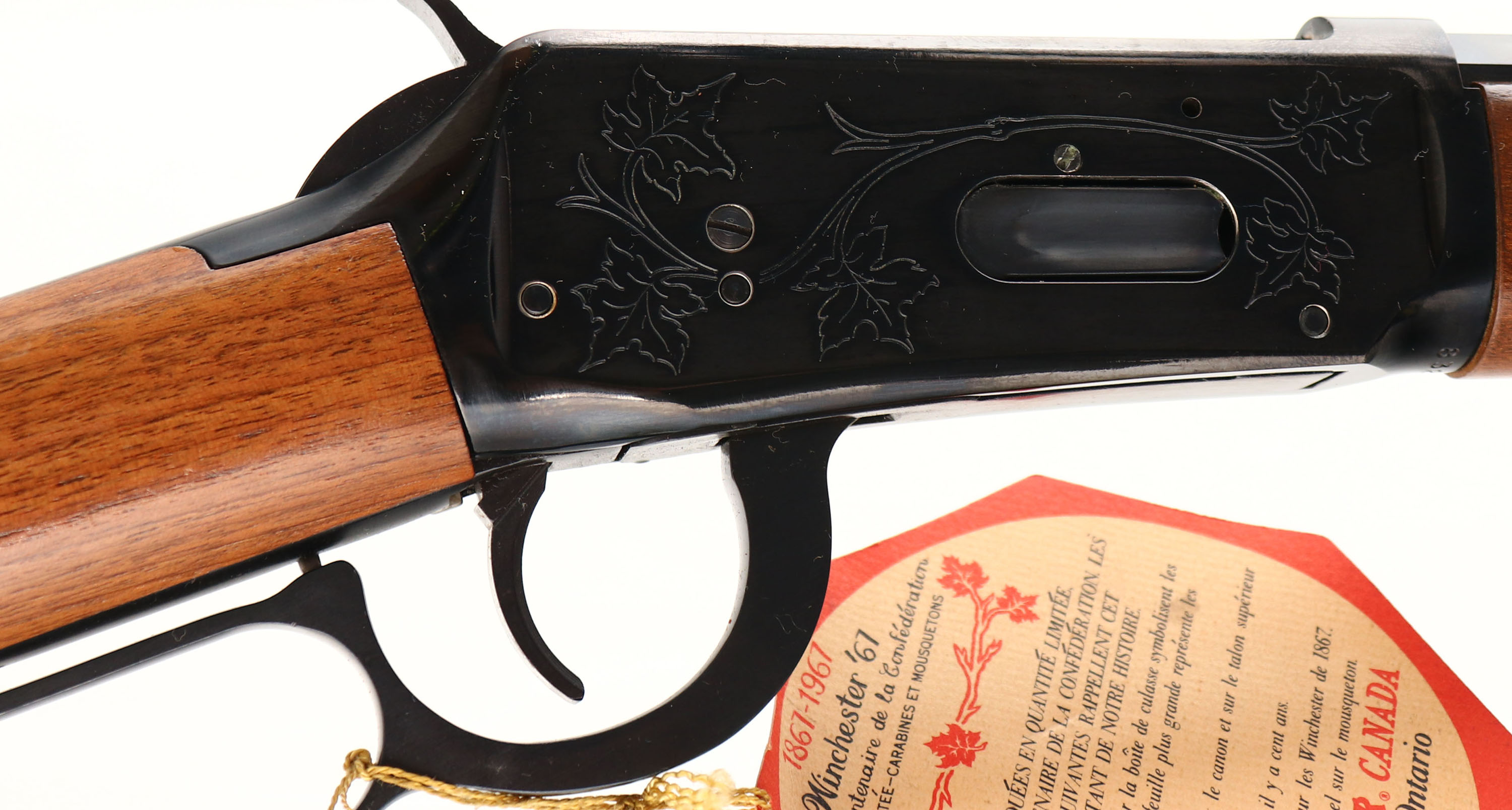 Winchester, Model 94 Canadian Centennial Commemorative, marked 30-30 Cal., MFG. 1967, U.S.A. produced, SN: 83285, Lever Action Rifle, 26'' Octagon barrel, full mag, The straight grip wood stocks are excellent, with excellent factory finish. There is one small contusion to the left side of the forend & a few very minor scratches the left wrist of the stock. The factory high gloss metal blue finish is excellent. The sides of the receiver have high quality Canadian themed (maple leaf) machine engraving. Bore is mint. Factory adjustable rear & tall blade front sights. This very early commemorative rifle is near new condition, with original hanging tag. FFL or C&R Req. - Value: 600 to 1200