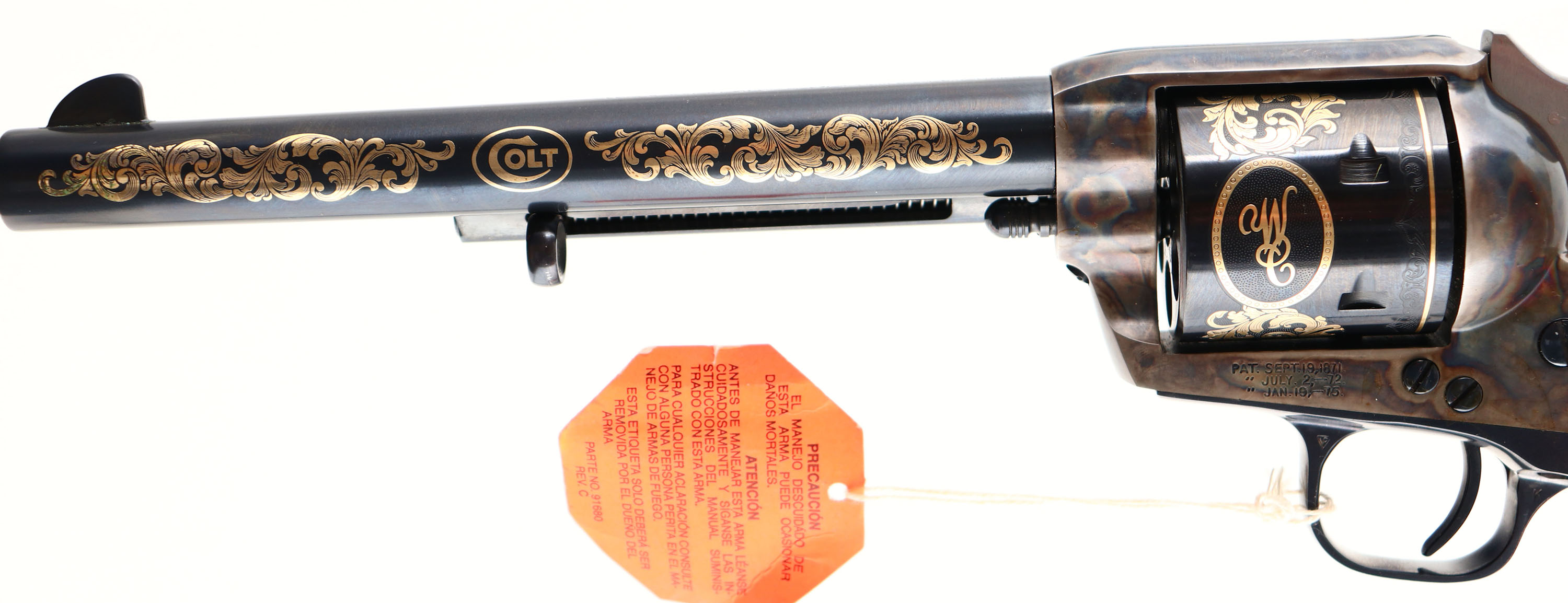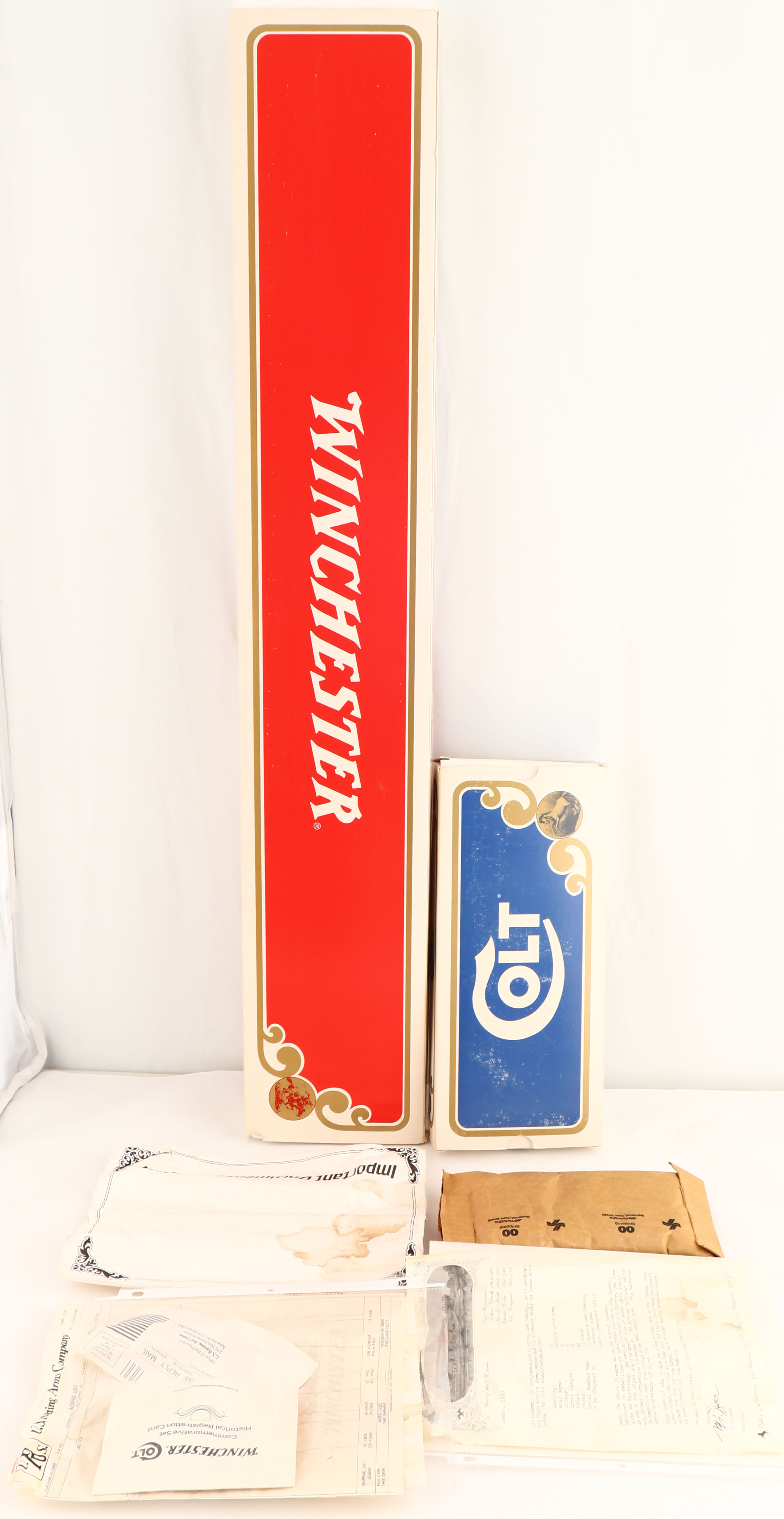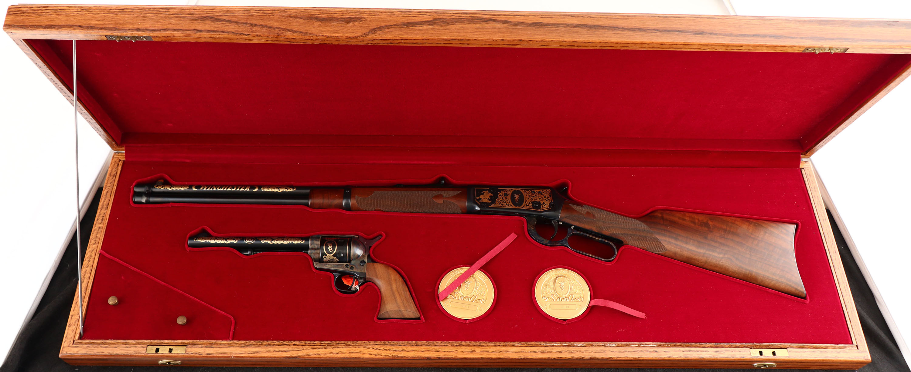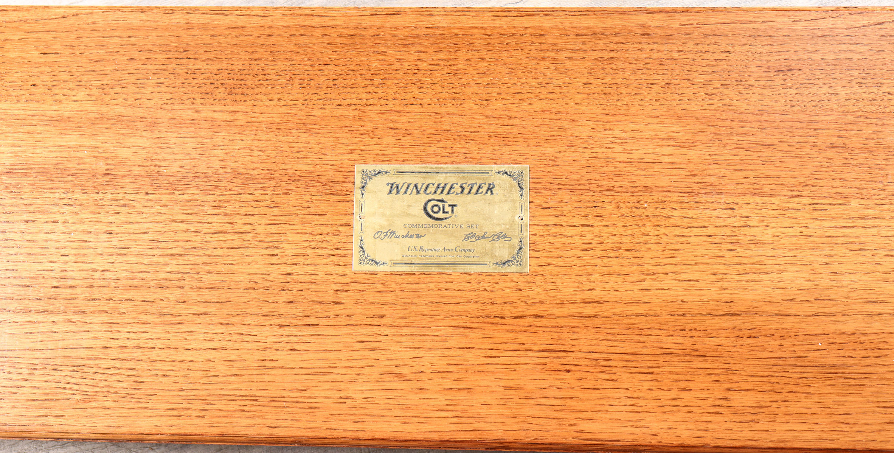Includes factory letters from Colt and U.S. Repeating Arms Co. as well as a shared oak presentation case with a brass Winchester/Colt commemorative plaque on the lid & two commemorative gold medallions. Both guns were unopened in original shipping box until we opened them to photograph them. NIB. FFL or C&R Req. - Value: 2000 to 4000