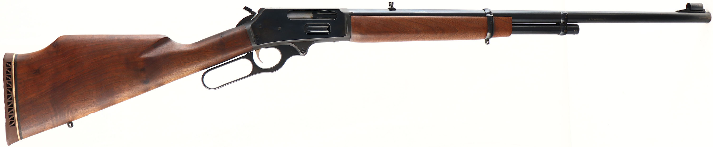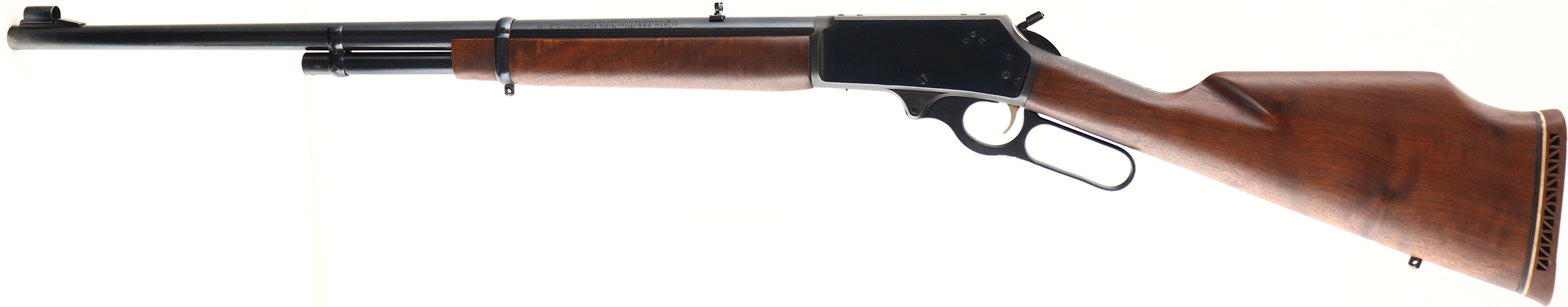 Marlin Firearms Co. Model 444, CAL: 444 MARLIN, MFG: Late 1960s, SN: AA29738, Lever Action Rifle, 24'' Micro-grooved barrel. The original straight grip Monte Carlo wood stocks are very good, as lightly sanded & re-oiled. The stocks have very few handling marks remaining. The original metal blue finish rates 95%. Bore is excellent. Receiver once carried a scope, with some residue remaining on top of receiver. The barrel carries a folding leaf rear & hooded ramp/blade front sight. Sling studs. Gold trigger. Buttstock carries a Marlin ventilated brown rubber recoil pad. JM hammer attachment. Bullseye trademark in belly of the stock. FFL or C&R Req. - Value: 500 to 800