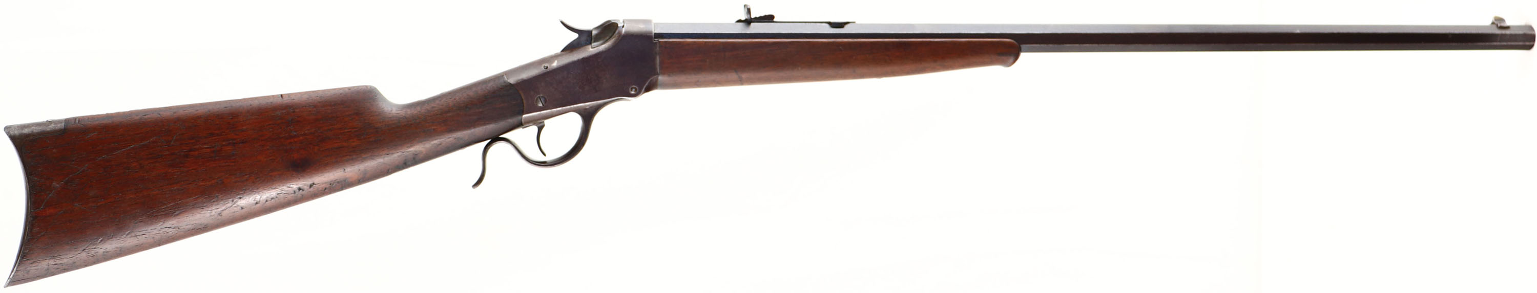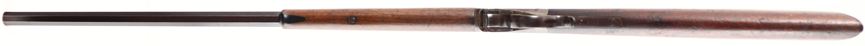 Winchester, Model 1885 Low Wall Rifle, Marked: 25 R.F., MFG. 1897, SN: 80220, Lever Action Single Shot Rifle, 26'' Octagon #1 marked barrel. The original wood stocks are very good, with numerous small contusions, scrapes & scratches the original finish. There are a dozen small notches on the top of the comb by the upper tang of the crescent metal buttplate. Ebony tipped forend. The original metal blue finish on the has toned to a even chocolate brown patina. Bore is fair, with lots of pitting & roughness amongst some visible rifling. The barrel carries an adjustable rear & pinched blade front sights. Metal crescent buttplate. The # ''1'' is stamped in front of the forend tip on the barrel, for barrel size. A solid & all original 1885 rifle. Antique No FFL Req. - Value: 500 to 1000