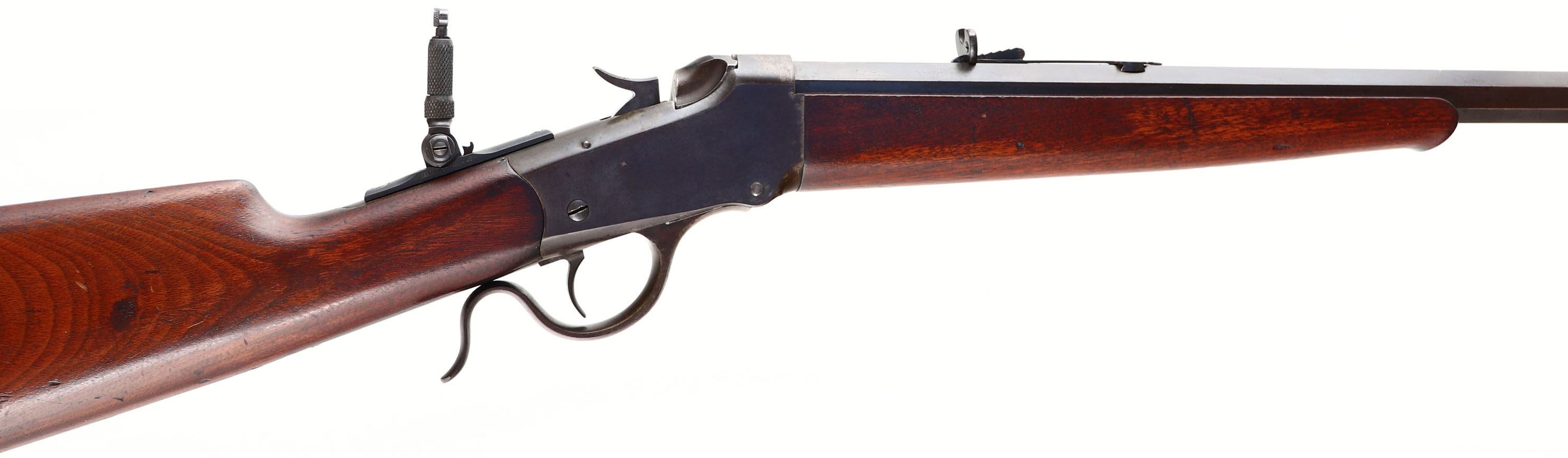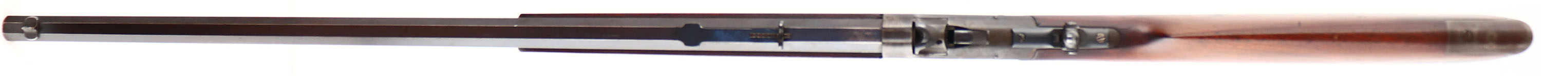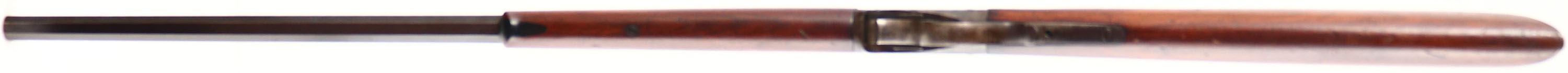 Winchester, Model 1885 Low Wall Rifle, .32 RF Cal., MFG. 1892, SN: 58290, Lever Action Single Shot Rifle, 26'' Octagon #1 marked barrel. The original wood stocks are excellent, with several minor contusions, handling marks & scratches the original thinning finish. The case-hardened receiver, block, lever, hammer & buttplate have worn or toned to a brown patina, with some smokey outlines of case-colors remaining mostly on the left side of receiver & in more protected areas. The original metal blue finish on the barrel is toning to brown patina, with 80% coverage. Bore is good, with spotty roughness amongst thinning rifling. The rifle is fitted with a Lyman flip-up tang sight, while the barrel carries the original adjustable rear & front sight. Metal crescent buttplate. The # ''1'' is stamped in front of the forend tip on the barrel. An original & authentic looking 1885 rifle. Antique No FFL Req. - Value: 700 to 1200