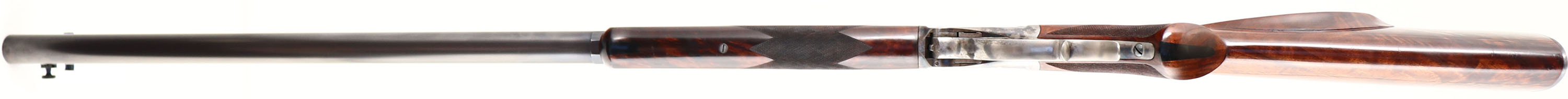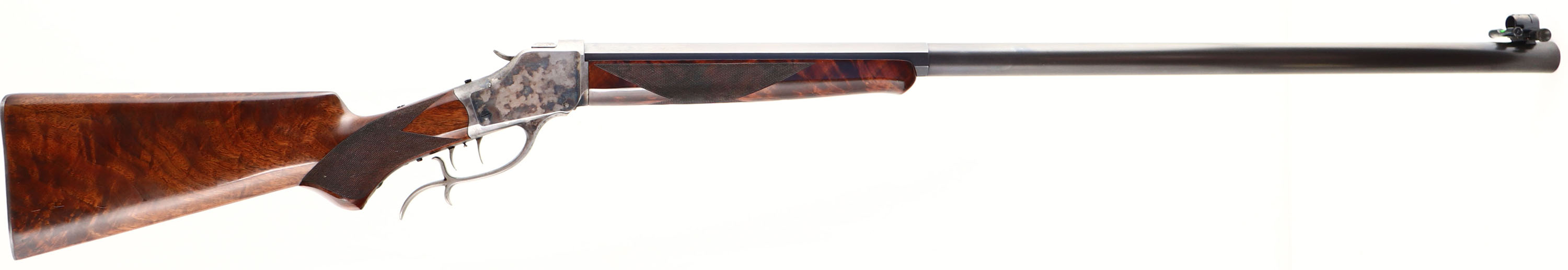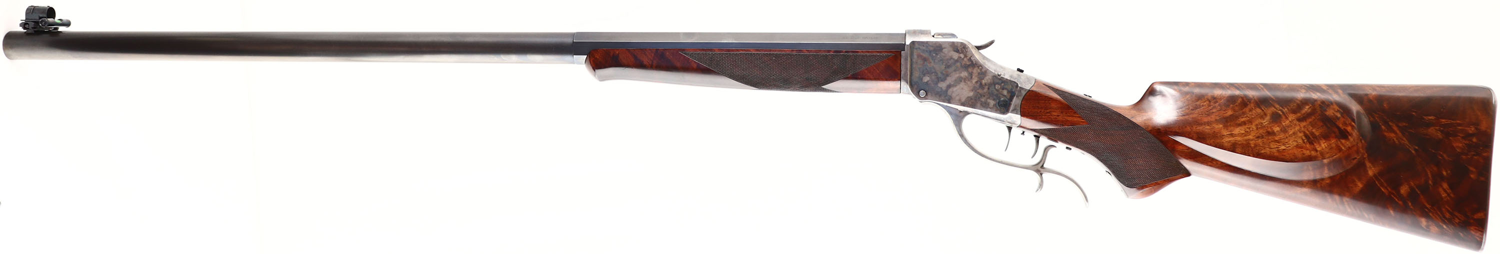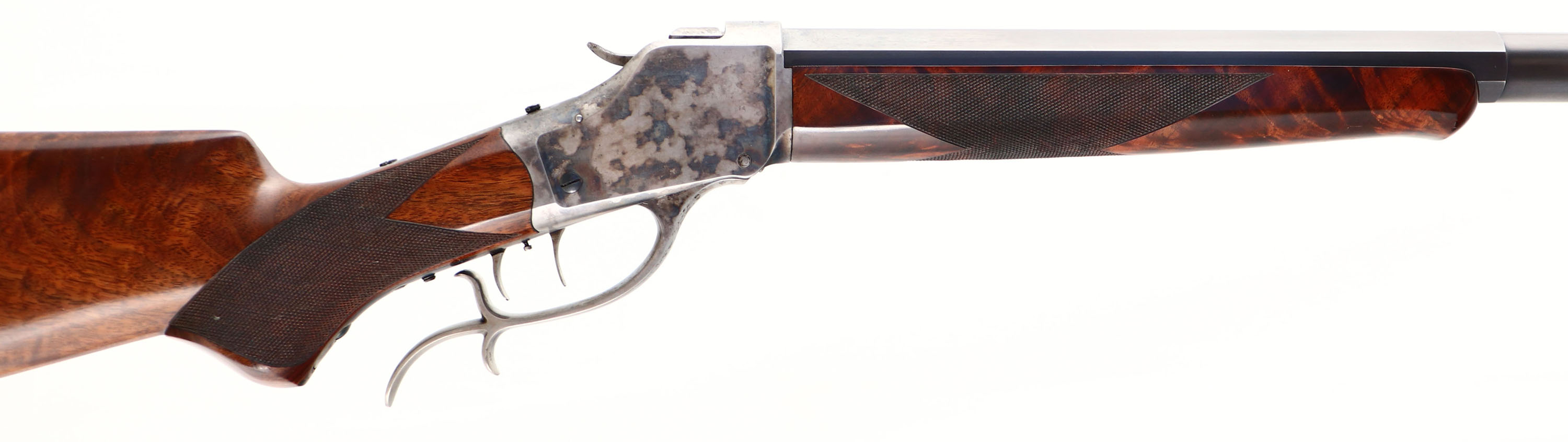 CUSTOM Meacham High Wall, Caliber Marked .45 2.1 MATCH, MFG. Modern SN: 369, Lever Action Single Shot Rifle, 32'' Octagon to round heavy barrel. Steve Meacham, was the owner of S.D. Meacham Tool & Hardware Co. in Peck, ID, now retired. He along with a few master craftsman he employed manufactured about 40 rifles a year total. Their replica guns are of the highest quality & have a large following. All of Meacham's guns are based on Winchester single shots made from 1885-1910. These handmade guns are used mostly for silhouette shooting, but also are good target guns. His Meacham 1885 High Walls featured a glossed walnut stock, with pistol grip/ raised cheek & Schnabel forearm, with black tip inlays, checkered metal buttplate, case-hardened receiver, a heavy barrels high luster royal bluing, adjustable flip-up rear tang sight (not currently on this rifle), dovetailed front globe sight with level & double set-triggers. The original wood stocks on this example are excellent, with a few minor contusions, handling marks & scratches the original finish. Wood grain is fantastic. The case-hardened receiver, block, lever, & hammer has faded case-colors of mostly gray & blue, some smokey outlines. The original metal blue finish on the barrel rates 95%. Bore is excellent. Missing the flip-up tang, but barrel carries the original globe silhouette front sight with spirit level. Checkered metal widow's peak shotgun buttplate. The breech end of the forearm & bottom flat of the barrel under the forearm is stamped with the matching SN ''369''. In addition, the same barrel flat is stamped ''BB'', ''45 21'', ''18'', ''450'' & ''458''. Fancy spur type lever. A fantastic, all original & authentic custom reproduction of an 1885 rifle. FFL Req. - Value: 1000 to 3000