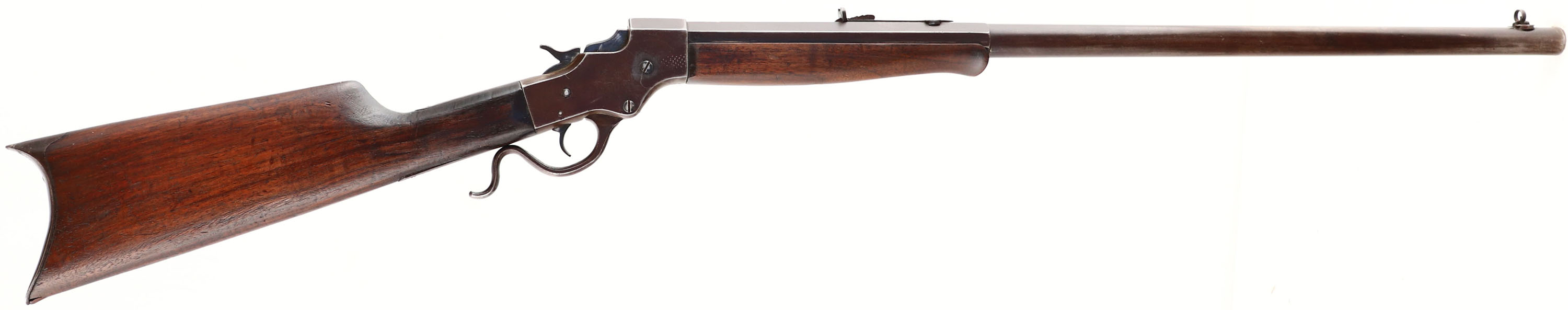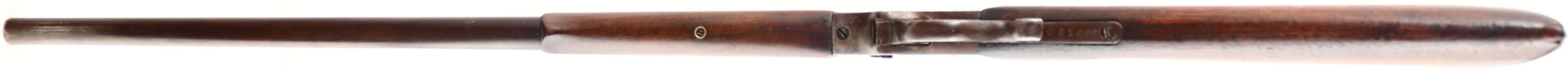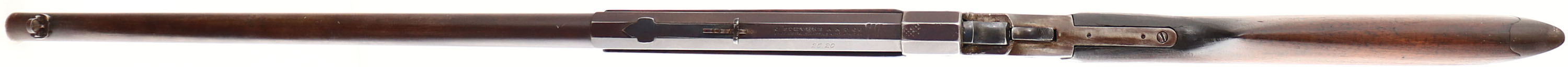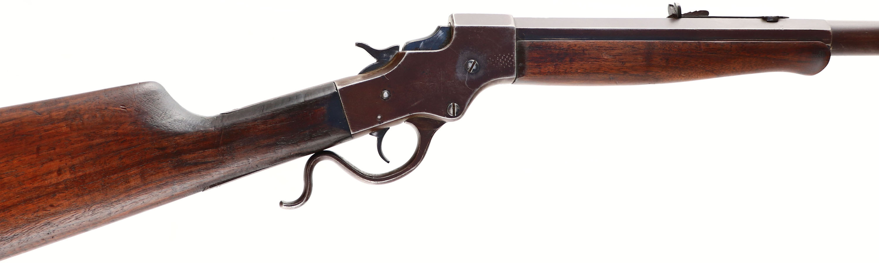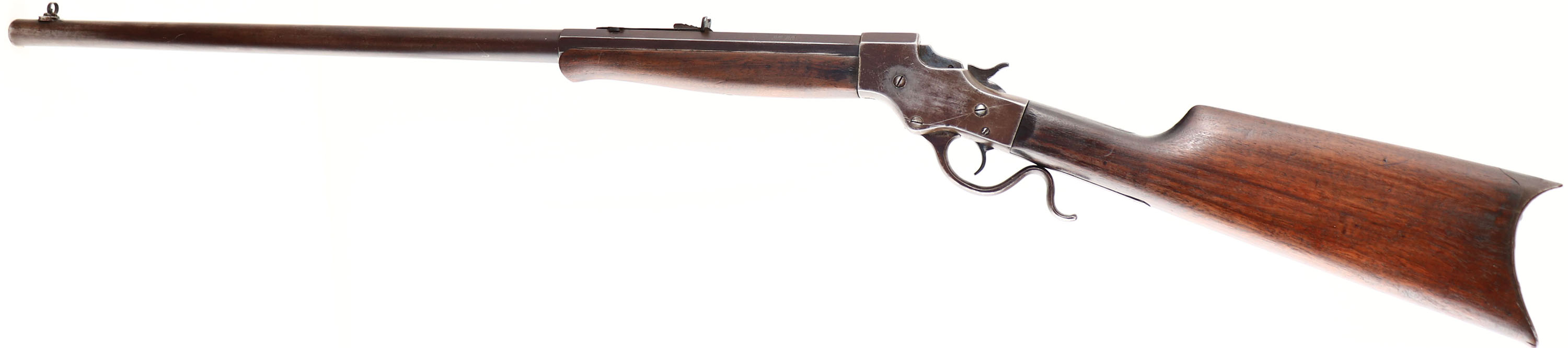 J. Stevens A & T Co, Model 44 Single Shot, CAL: 25-20, MFG: 1894-1932, SN: 61441, Lever Action Falling Block Rifle, 26'' Octagon to round barrel. The original straight grip wood stocks are very good, as having been sanded re-oiled long ago. There is a small raised chip at the toe of the stock & other small nicks, dings & contusions. Schnabel tip forend. The metal finish has toned to a chocolate brown patina. Bore is good, with roughness amongst strong rifling. The barrel carries an adjustable rear & folding globe front sights. Crescent metal buttplate. Matching SN on lower tang & on barrel. There is some chatter vise marks on the receiver top & sides. From FFL or C&R Req. - Value: 300 to 600