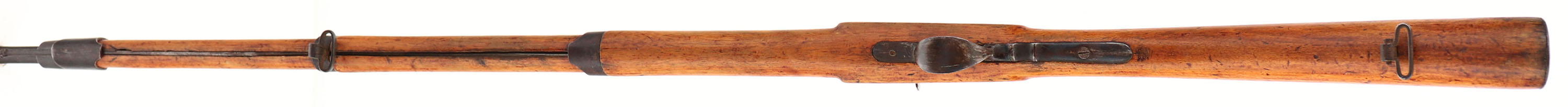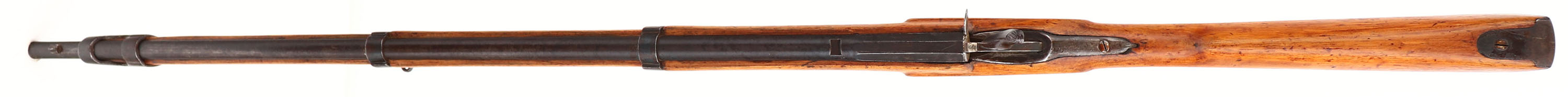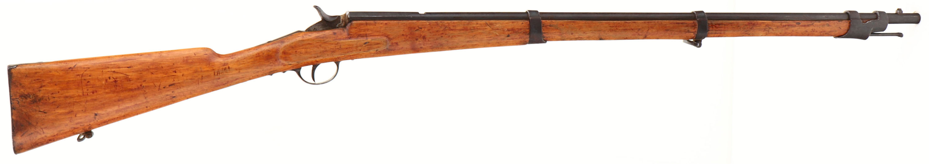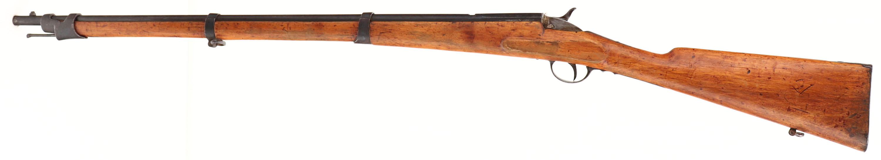 Belgium, Flobert Cadet Rifle, Appears to be 32 RF Cal., SN: None, MFG. Circa 1870, Antique, Rolling block rifle, 27 7/8'' Round barrel, This is a very interesting small Cadet Rifle, made using the rolling block system designed by Louis-Nicolas Flobert, the inventor of rimfire ammunition. The barrel is fully rifled. The walnut wood stock goes almost to the muzzle & has three iron barrel bands. The trigger guard & the buttplate are also of iron. The left side of the barrel is marked with Belgian markings, including E / L G / * in an oval & ''Belgium''. The original wood stocks is very good, having been lightly sanded & refinished, with numerous minor handling marks, scratches or contusions. The metal on the barrel is a mix of remaining blue & a developing brown patina. Some wood finish on metal. Barrel has an open rear dovetail & a small box blade front sight. Bore is good, clean, but with scarring amongst thinning rifling. Original metal buttplate. Metal cleaning rod. Sling loops in stock & on barrel band. Antique, No FFL Req. - Value: 300 to 500