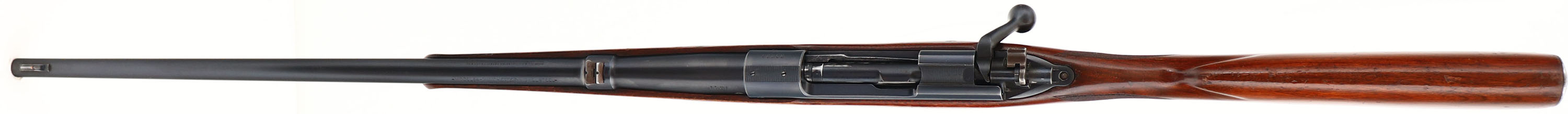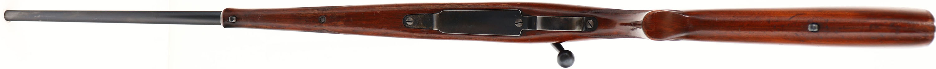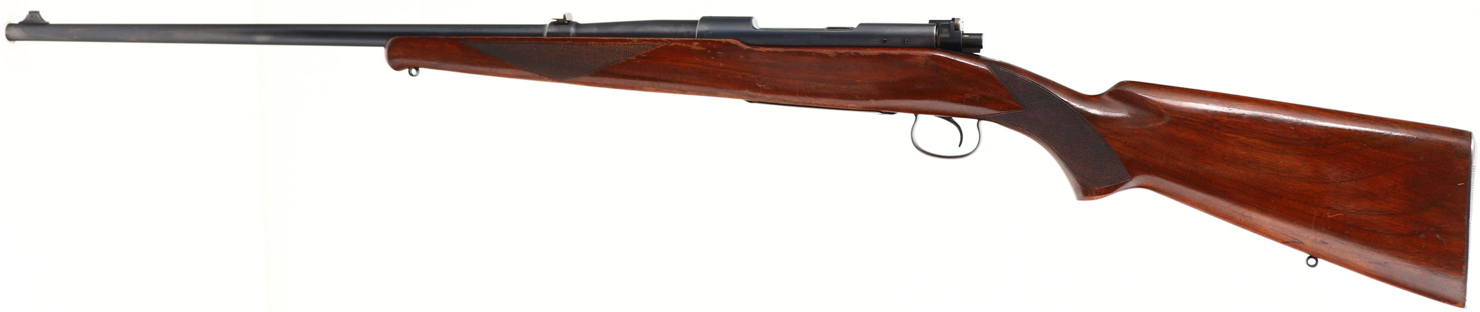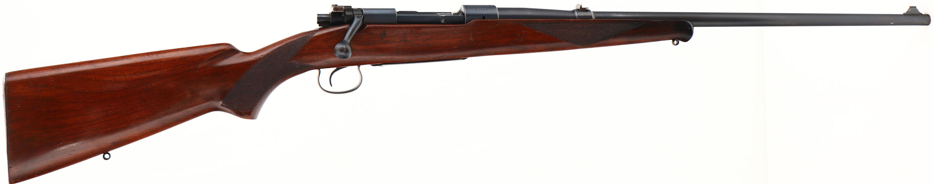 RARE Winchester Model 54, CAL: .30 U.S., MFG: 1929, SN: 20228, Bolt Action Rifle, 24'' barrel. The model 54 was the first successful civilian production run of a centerfire bolt action for Winchester. They are fairly rare model with total production of just over 50,000 in all variations from 1929 to 36. The Model 54 Winchester was catalogued in ten calibers: .22 Hornet, .220 Swift, .250 Savage, .257 Roberts, .270 Winchester, .30-30 Winchester, .30-06 Springfield, & three metric calibers 7X57 MM, 7.65X53 MM, & 9X57 MM. Chamberings other than the ten listed were available on special order. These include .25-35 Winchester, .32 Winchester Special, .35 Whelen,& possibly a few others. During the hard times in the late 1920s & early 1930s, buyers of rifles were not prone to paying for special order items. Consequently, very few Model 54s were produced in other than the ten listed chamberings. That makes this rifle chambered in .30 U.S. very rare. The original checkered & flat pistol grip wood stock on this example is very good, with several small surface scrapes to the original finish, along with other minor contusions or scratches. There is a 1'' crack repair at the forend tip. The original metal blue finish rates 95% on the barrel & receiver, while the floorplate & trigger guard rate 70%. Bore is excellent. The rifle is fitted with a two leaf rear & pinned blade front sight. Buttstock carries the original serrated metal buttplate. Sling eyelets. An all original & high condition examples in the rarely encountered 30 U.S. Caliber. FFL or C&R Req - Value: 2500 to 4500