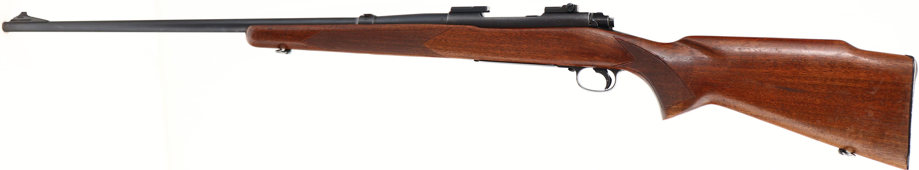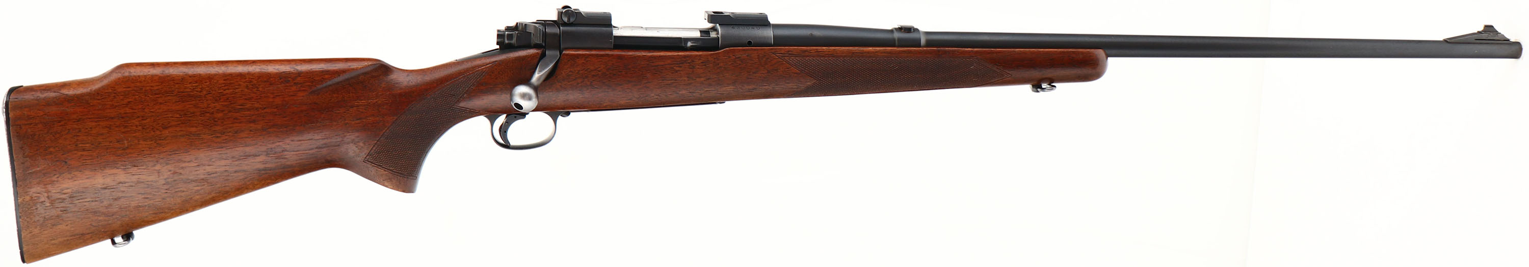 Winchester, Model 70, CAL: 220 SWIFT, MFG: 1957, SN: 430040, Bolt Action Rifle, 27'' barrel. The original & checkered flat pistol grip Monte Carlo stock is excellent & solid, with minor contusions, scrapes & some small edge chipping along edge of buttplate. The original finish has thinned or worn in areas, with some flaking & dullness, mostly to the lower half & belly of the stock. The bottom of the pistol grip has ''0898'' stamped on it, which is unattributable. The metal finish rates 95% overall, with most of the wear found at the muzzle tip & floorplate edges. Bore is excellent & bright. The receiver carries scope mount blocks, while the barrel has a blank filled rear dovetail & ramp elevated blade front sight. Stock carries a checkered metal buttplate. Sling loops present. Trigger shoe added to original trigger. Matching SN bolt. This is one of the more desirable small bore calibers within the Pre-64 model 70's. FFL or C&R Req. - Value: 1200 to 2400
