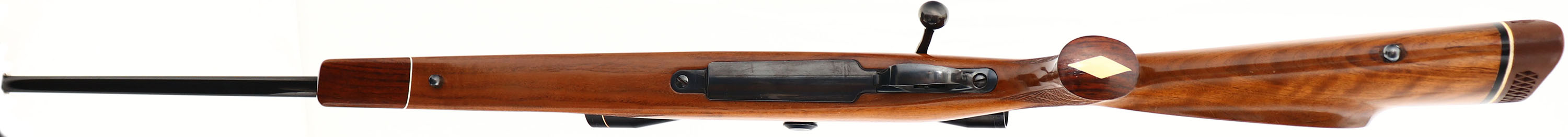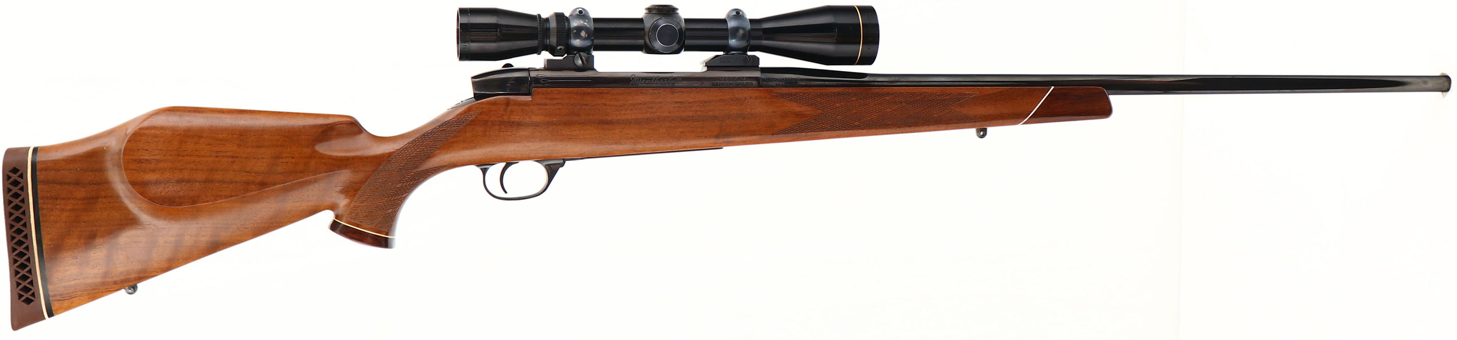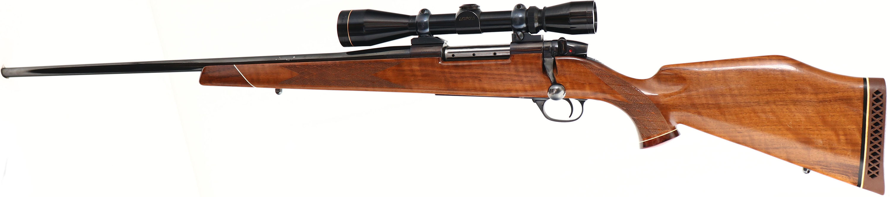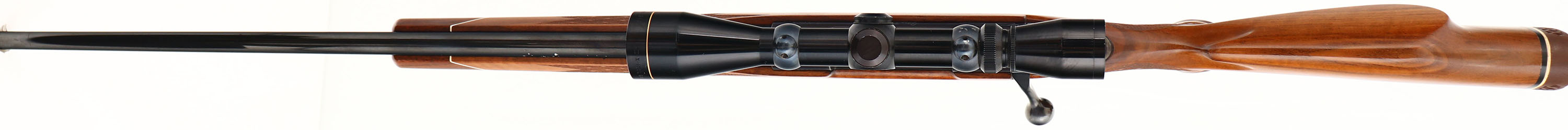 RARE Weatherby, Model MARK V Deluxe, LEFT HANDED, Marked 7MM MAGNUM, MFG. 1963, SN: 38804, Bolt Action Rifle, 24'' Round fast tapered barrel. Early W. German, first series production without letter prefix. The 7mm Weatherby, designed by Roy Weatherby in 1944, was developed from a 300 H&H case, it is a belted case that sports Weatherby's iconic double radius shoulder. The cartridge was one of the first cartridges offered by the Weatherby company. The factory Monte Carlo cheeked walnut stock is excellent & original, with early factory skip-line checkering & rosewood/white diamond pistol grip cap & tipped forend. The factory finish is excellent, with a tiny bit of spider webbing beneath the cheek The original high luster metal blue finish is 98% on barrel, receiver & floorplate, while the receiver has toned to a lovely plum, which is typical of these early production Weatherby rifles. Bore is excellent & bright. Mounted with a Leupold Gold Ring 3x9 VARI-X II scope on Buehler blocks & no open sight provisions. Stock carries the original Weatherby ventilated recoil pad. Factory sling studs. The 7mm Weatherby Magnum is a very adequate cartridge for hunting medium to large-sized deer such as mule deer, moose & even elk, up to long ranges due to its plain trajectory with bullets of different weights & due to the high ballistic coefficient the 7mm bullets are praised for. However, with adequately constructed bullets, the 7mm Wby Mag may be used for hunting larger game, including the great bears & the American bison. Bluebook states 20 to 30% premiums are paid for these early pre-prefix Mark V rifles, particularly when LEFT HANDED. An overall excellent, high original condition, & early vintage Weatherby in a collectable magnum caliber. FFL or C&R Req. - Value: 1500 to 2500