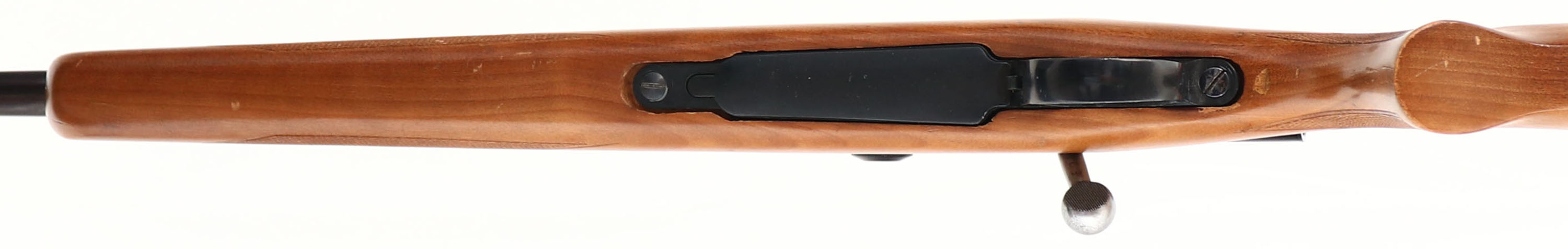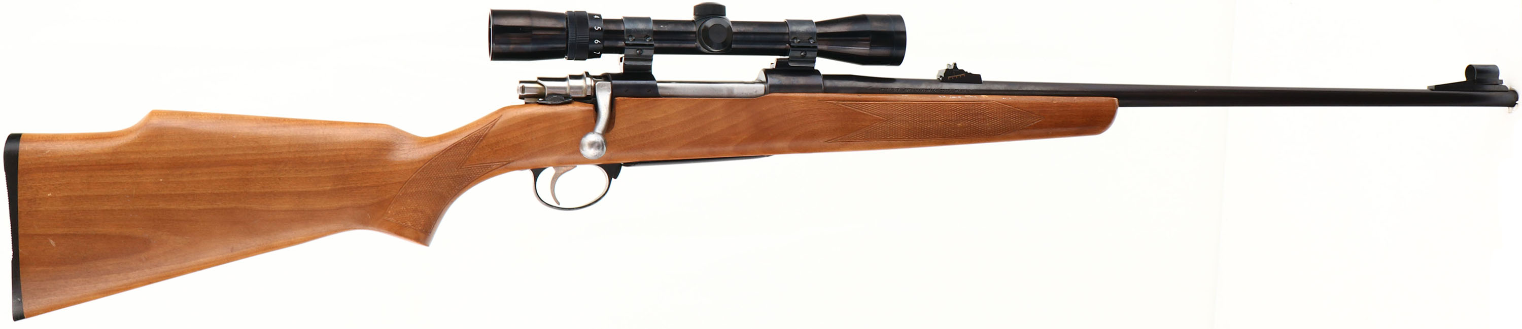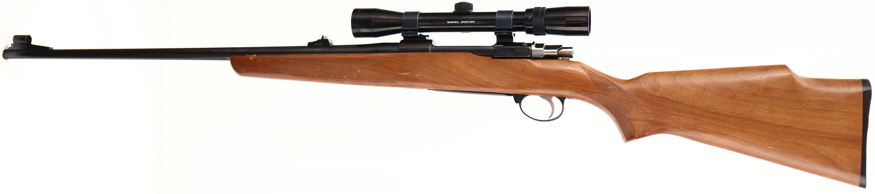 Firearms International Corp., Model FN Action Musketeer II, CAL: 7mm MAG, MFG:1963-72, SN: E2134, Bolt Action Rifle, 24 1/4'' round barrel. The original checkered & flat pistol grip Monte Carlo wood stock is excellent, with some light handling marks or contusions to the original finish. The original metal blue finish rates 95% overall. Bore is excellent. The receiver holds a Bushnell Sportview 3-9 scope on Weaver mounts, while the barrel holds a slide adjusting rear & hooded ramp front blade sights. Stock carries a serrated plastic buttplate. Excellent overall. FFL or C&R Req. - Value: 300 to 600