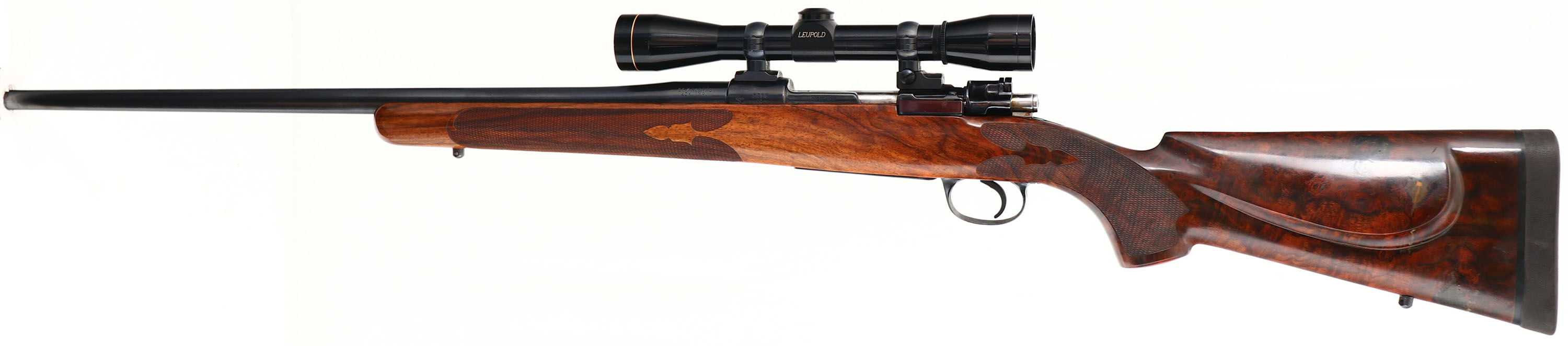 Custom Rifle, Built in the H&K Gun Shop on a German K98K Action, CAL: 257 Roberts Ack Imp., MFG: 1940's (action), SN: 5768, Bolt Action Rifle, 24 1/2'' Round barrel. A fantastic custom built rifle utilizing a WWII German Nazi military rifle action, with the Iron Eagle stamped on the left side of the receiver collar. The custom checkered, cheeked & flat pistol grip walnut stock is excellent, with excellent finish. Beautiful birds eye grain & extra fine hand checkering. The stock shows epoxy filled natural grain pockets mostly to the sides of the stock. The metal blue finish rates 95% overall. Bore is excellent. The receiver holds a Leupold Gold Ring M8-6X scope, while the barrel carries open sight provisions. Stock carries a solid rubber recoil pad. Sling studs. Excellent overall. FFL or C&R Req. - Value: 500 to 1000