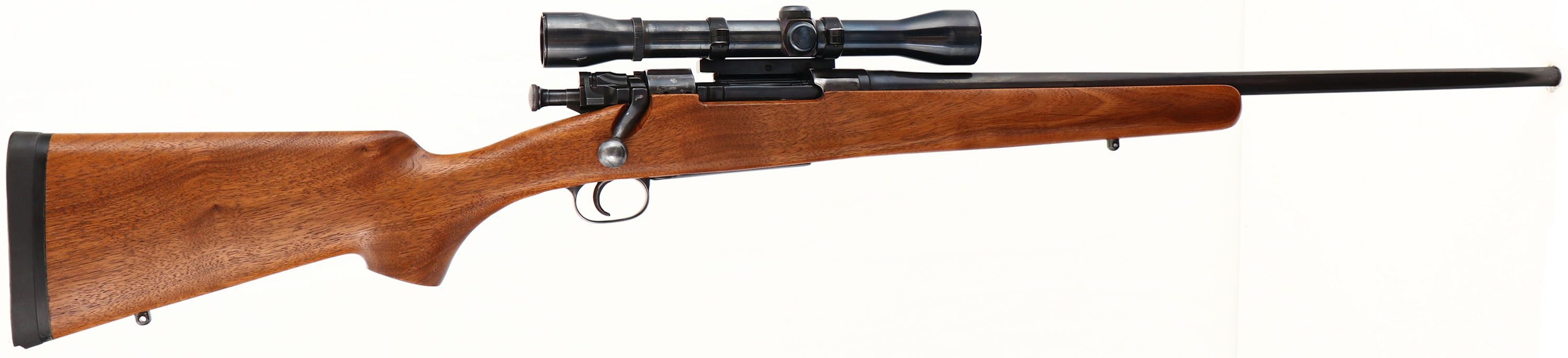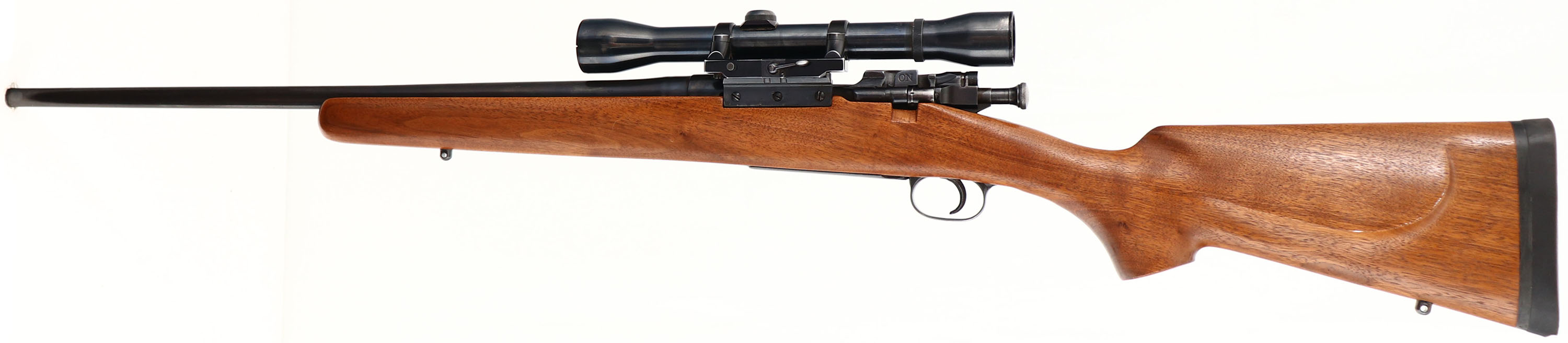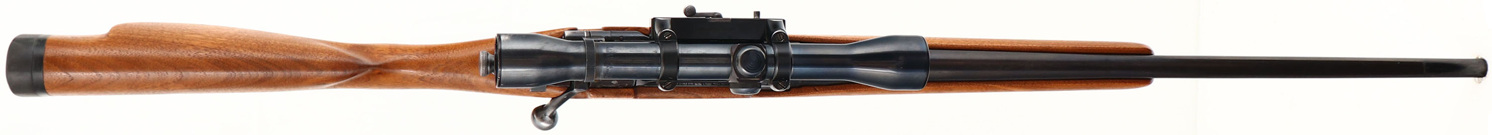 Sporterized Rifle, Built from a Remington 03-A3 Action, CAL: 30-06, MFG: 1942 (action), SN: 3443630, Bolt Action Rifle, 22'' Round barrel. WWII rifle & a first year production 03-A3 rifle. The upgraded cheeked & flat pistol grip wood stock is excellent, with few minor contusions the stock's original finish. The metal blue finish rates 75% overall. The barrel appears to be the original, having been shortened & with the front sight removed. No original receiver sight, as receiver now carries a Weaver K4 60-B scope mounted on side detachable Paul Jaeger mount. Bore is excellent. Stock carries a sold Kickeez recoil pad. Bolt handle has been altered to a swept back position. Sling studs. An excellent sporterized or custom military to hunter conversion. FFL or C&R Req. - Value: 300 to 600