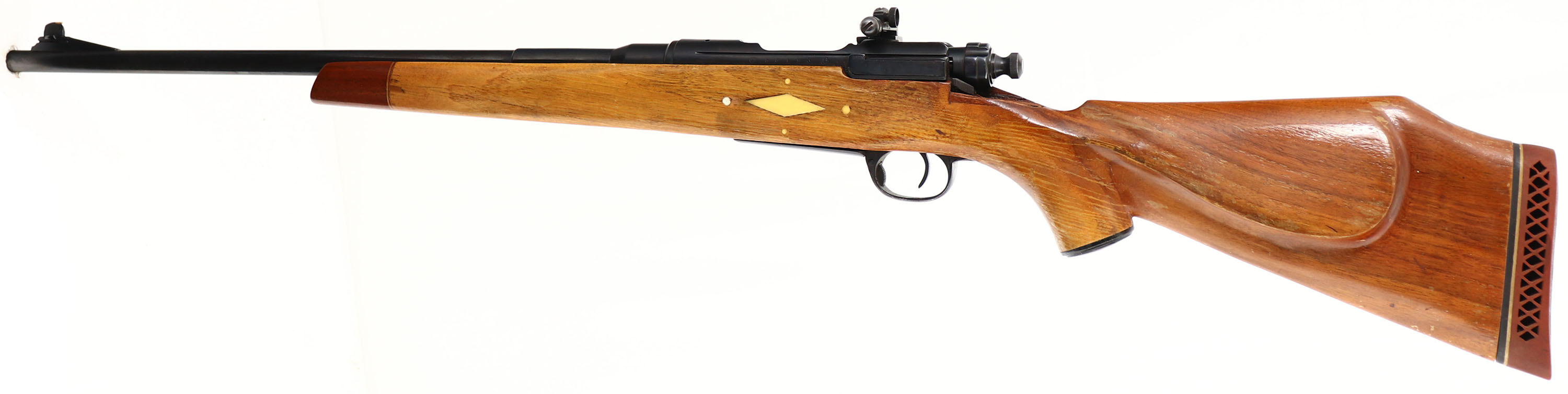 Sporterized Rifle, Built from a Kokura Arsenal Type 38, CAL: 6.5x257mm, MFG: 1937-41 (action), SN: 88193, Bolt Action Rifle, 20 3/4'' Round barrel. The upgraded cheeked & capped pistol grip Monte Carlo style wood stock is good & solid, but with a large missing wood chip behind the bolt at the top of the wrist. The stock has three inlaid faux ivory diamond shapes surrounded by four circles at the points. The stock also has a contrasting wood forend tip. The are some minor contusions or handling marks to the thinning & flaking stock's finish. The metal surfaces were buffed, polished & reblued, retaining 85% reblued finish. The barrel appears original, having been cut down & carrying a replaced tall blade front sight, while the receiver carries an adjustable Redfield right side mounted sight. Bore is very good. Stock carries a Pachmayr ventilated recoil pad. Replaced & modified bolt handle. Rifle is missing the magazine follower. We recommend rifle visits a gunsmith before attempting to fire to repair & confirm proper functionality, & is therefore being sold ''AS-IS'' with no returns. FFL or C&R Req. - Value: 150 to 300