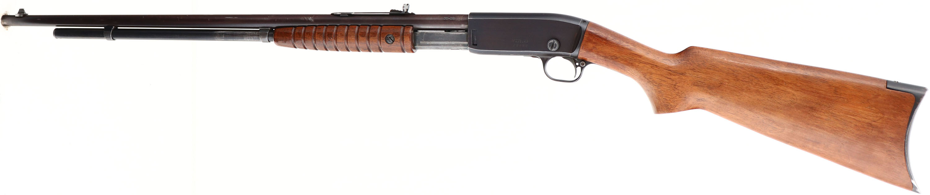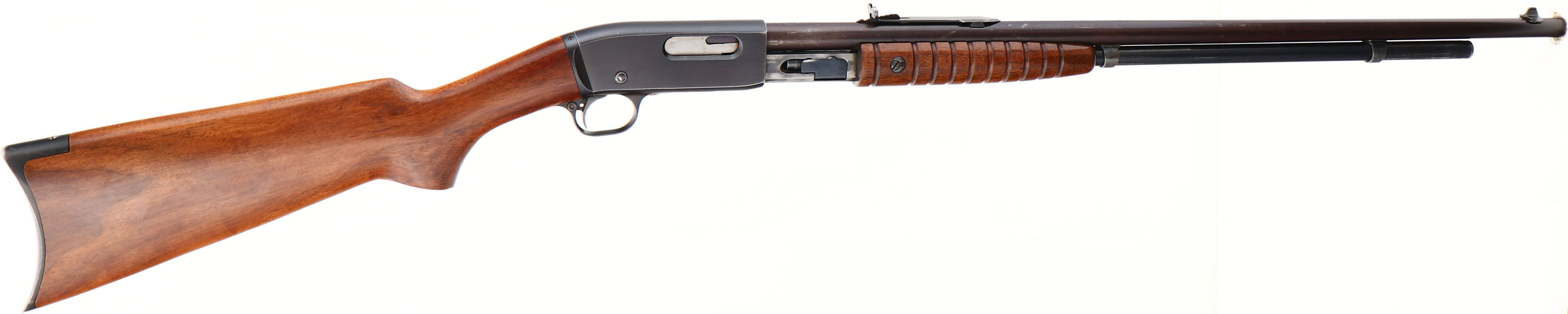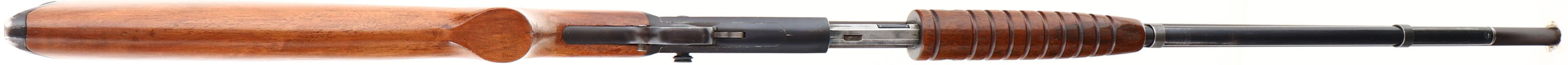 Remington, Model 25, marked 25-20, MFG: 1923-36 SN: 29456, Pump Action Take-down Rifle, 24'' round barrel. The original flat pistol grip wood stocks are excellent & solid. The original finish is excellent, with use thinning the finish along the sides of the forend. There is a tightly glue repaired hairline crack at the tip of the forend & few finish level light scratches or handling marks. The original factory metal blue finish has 90% coverage on receiver, 80% on the mag tube & barrel, with the barrel finish fully toning to a thinning plum tone. Bore is excellent. Barrel carries an adjustable rear & standard front sights. Remington stamped crescent metal buttplate. These smaller caliber & light weight pumps were popular for small game & varmint hunting & most saw heavy use. With less than 32,000 model 25 rifles produced, this last year example is fairly rare. This is a high & original collectors condition rifle. FFL or C&R Req. - Value: 1250 to 2000