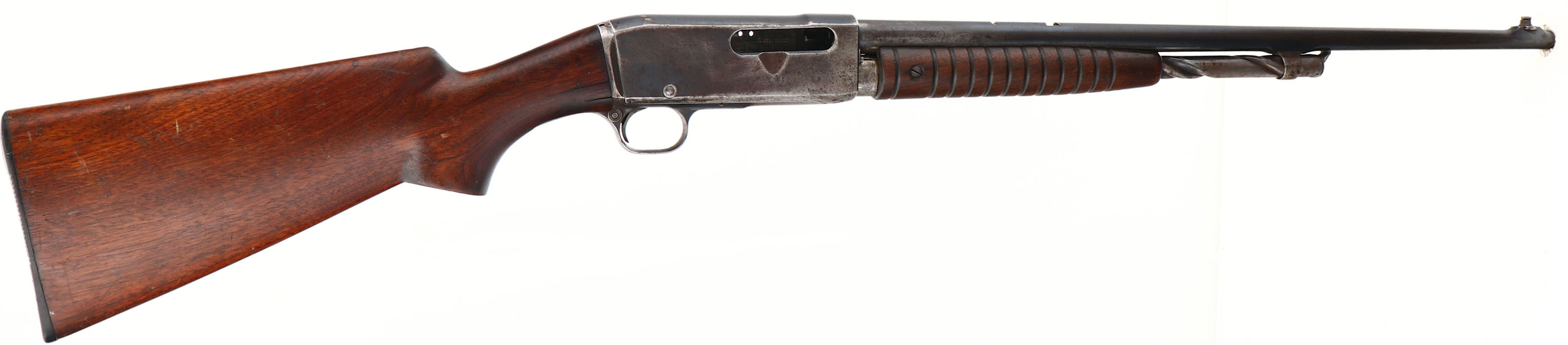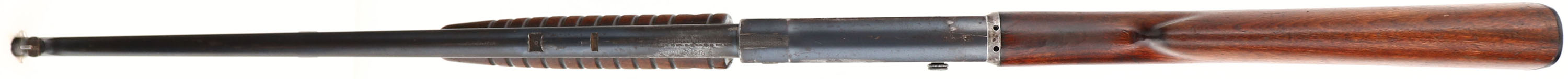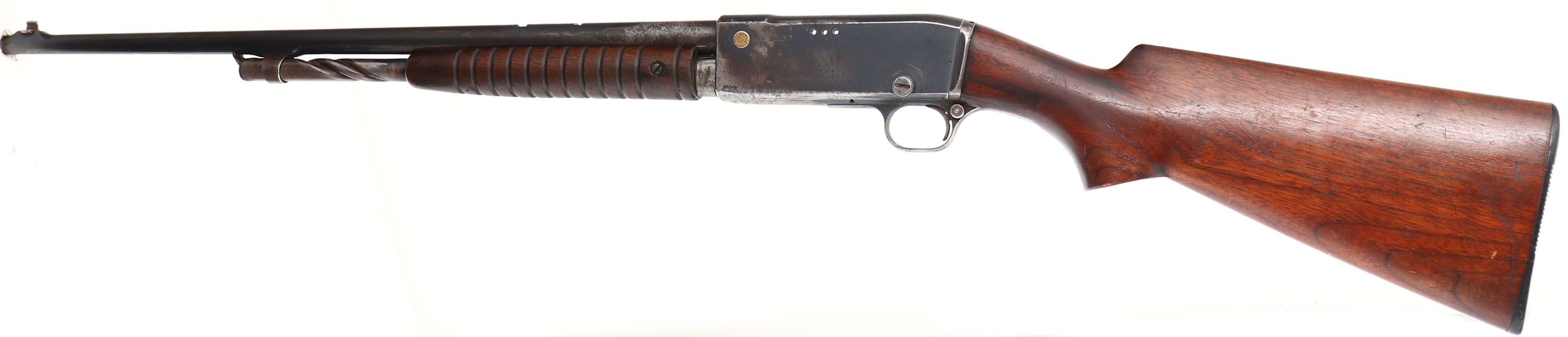 Remington, Model 14, (PARTS RIFLE), .30 REM Cal., MFG. 1920, SN:76058, Pump Auction Take-down Rifle. 22'' round barrel. The pistol grip stock appears to be a model 141 replacement & is good & solid. There are however, two 1.5'' stress cracks at the right side of wrist. The original forearm is very good. There are small handling marks & light contusions. The original metal finish has worn mostly gray, with some remains of original blue & a thin brown patina. The left side of the receiver has three open holes, likely from a previous scope mounting, needs filler screws. Bore is good. Barrel carries a ramp front sight, with an open dovetail & extra slot from the original rear wheel sight missing. Stock carries a replaced plastic buttplate. Action is frozen, with bolt stuck to the rear of the receiver. Don't know why, but there maybe some additional missing non-visible internal parts which might restrict normal function once action is unstuck. Therefore, we recommend this rifle be examined & repaired by a gunsmith before attempting to operate. Thus, this rifle is being sold as a parts rifle & is therefore being sold ''AS-IS'', with NO RETURNS! FFL or C&R Req. - Value: 150 to 300