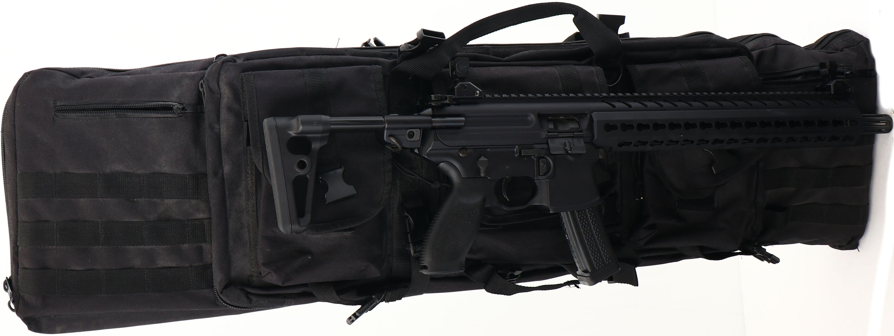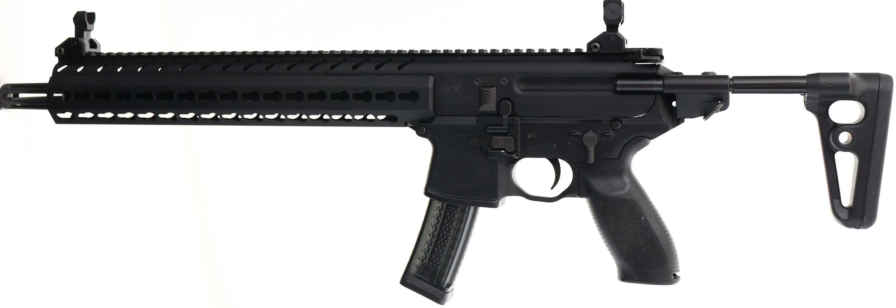 Sig Sauer, MPX PCC, CAL: 9mm, MFG: Modern, SN: 62B029141, Semi Auto Carbine, 16'' barrel. The synthetic textured grip is excellent. The hard coat anodized matte black finish on the upper & lower rates 99% overall. Bore is excellent. Flip-up sights. Full length upper picatinny rail for optics & key mod forend for accessories. 5-position telescoping stock. Comes in a Fieldline soft case, with paperwork, (5) mags, extra parts & lock/key. FFL Req. - Value: 1500 to 2200