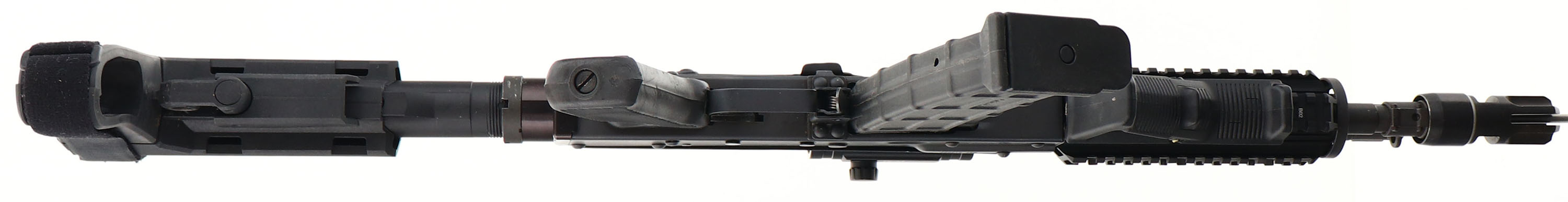 Zastava, ZPAP-85, CAL: 5.56, MFG: Modern, SN: Z85-012099, Semi Auto, 11'' barrel. The 5-pt adjustable arm brace, grooved synthetic grip & forend grip are all excellent. The matte black finish on the receiver & AK-74 dust cover rates 97%, with minor spotting toned to a brown patina. Bore is excellent. Factory iron sights. Receiver picatinny holds a ProPoint 1x30 red dot. Quad-picatinny forend for accessories. Comes with a quick detach AK style sling. FFL Req. - Value: 900 to 1400