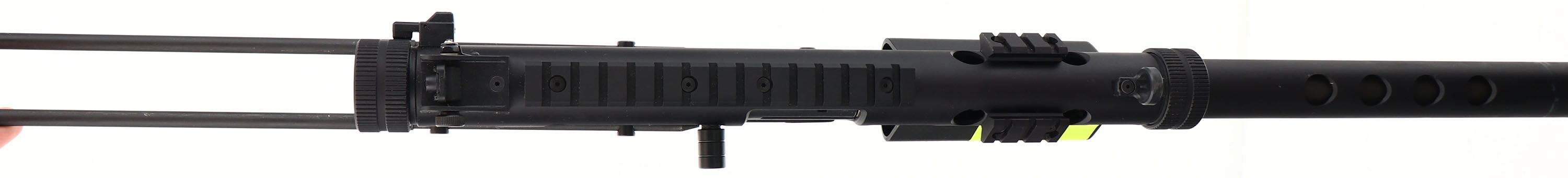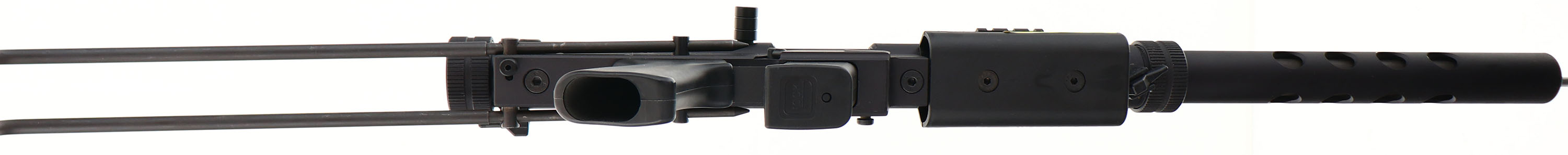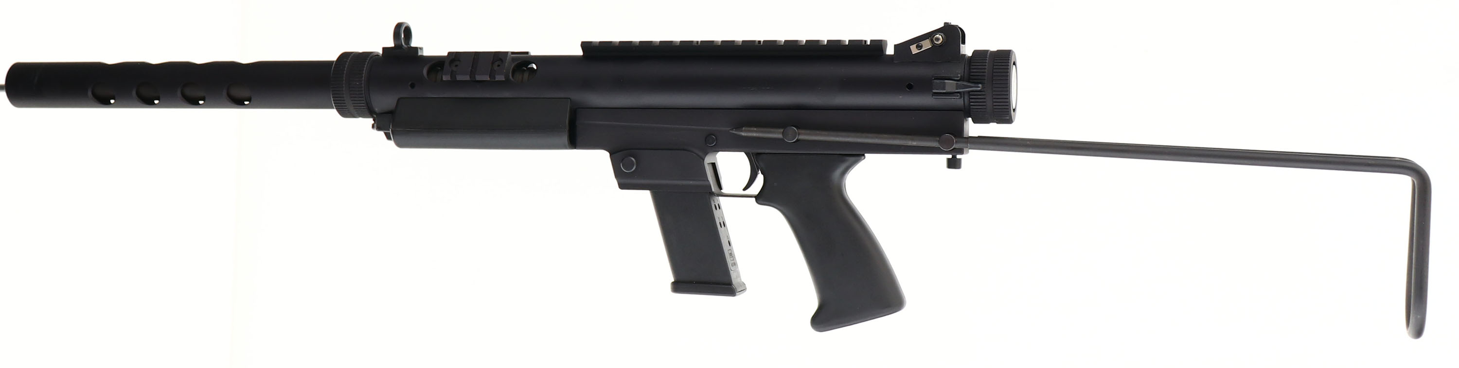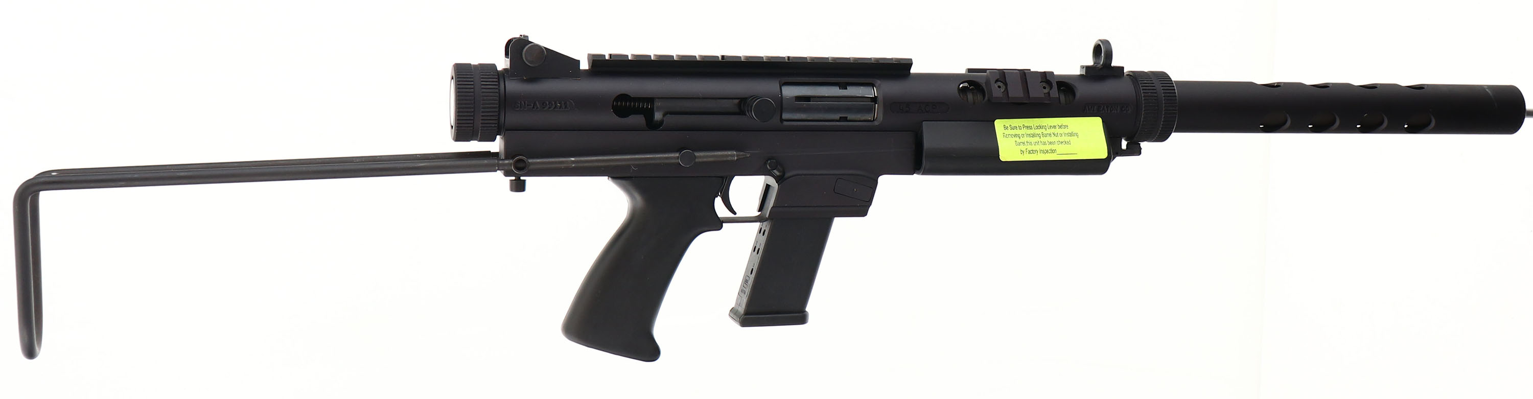 NEW & CASED, AWI Eaton Co./ Feather-USA, RAV 45 Takedown Carbine, CAL: 45ACP, MFG: Modern, Sn: A99111, Semi Auto Carbine, 17'' barrel. The smooth plastic grip & aluminum frame are excellent. The matte black finish rates 99%+ overall, with minor handling & storage marks. Bore is excellent. Factory iron sights. (3) picatinny rails for optics & accessories. Two-way wire stock. Glock 13rnd mag. Comes in factory carrying case, with related paperwork. FFL Req. - Value: 600 to 900