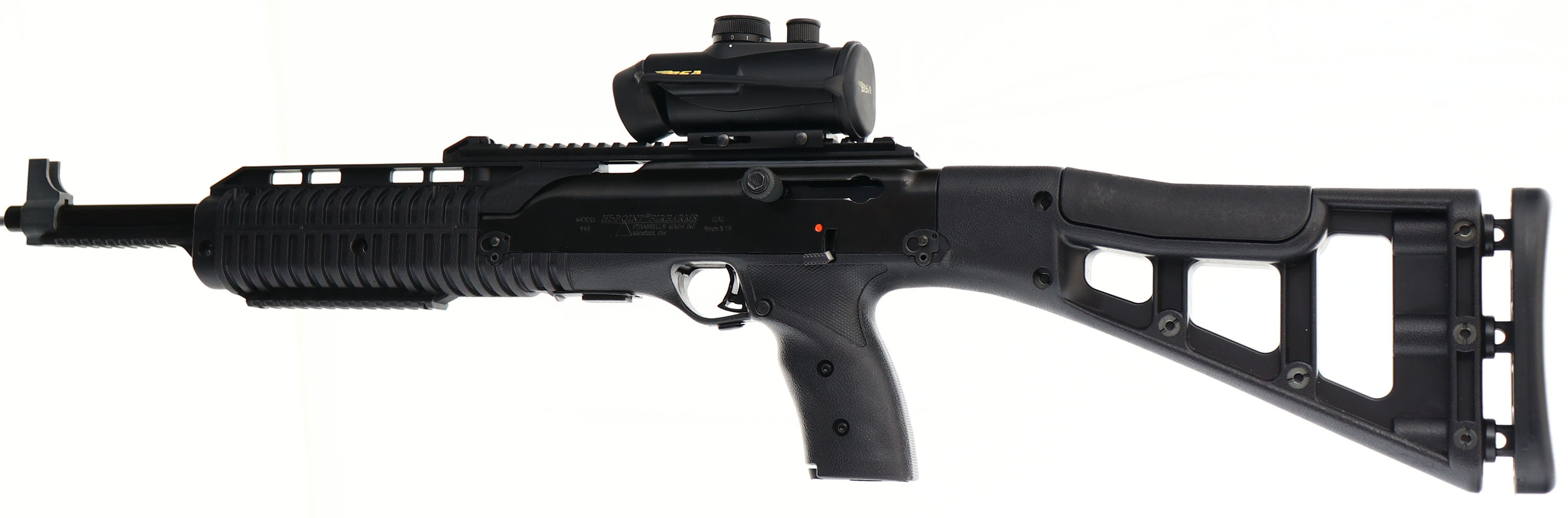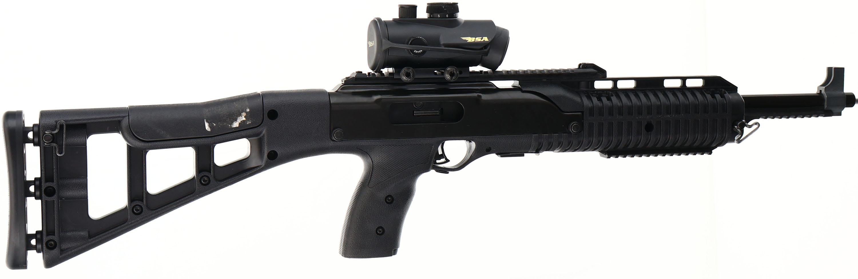 Hi-Point, Model 995, CAL: 9mm, MFG: Modern, SN: F154322, Semi Auto Rifle, 16 1/2'' barrel. The synthetic one piece stock/grip is excellent. The matte black finish rates 99% overall. Bore is very good & bright, with consistent roughness amongst strong rifling. Iron sights. BSA Red Dot sight. Canvas sling. Comes with paperwork & extra parts including two extended magazines. FFL Req. - Value: 300 to 400