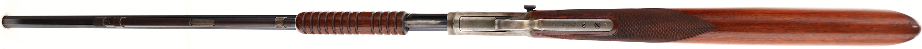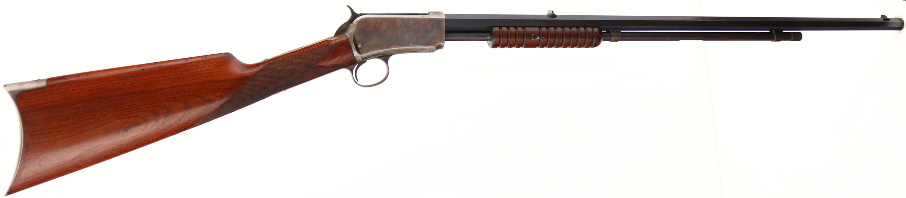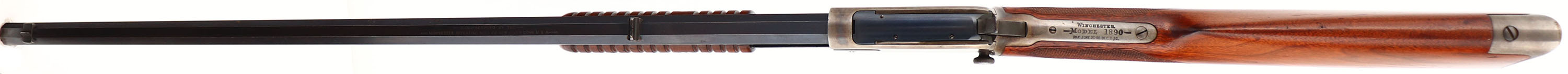 RARE DELUXE Winchester, Model 1890, 2nd variation, .22 WRF, Cal., MFG. 1896 (Antique), SN: 42241, Pump Action Rifle, 24 1/4'' Octagon barrel. The deluxe, hand checkered & straight grip wood stocks are excellent, with excellent finish & a few tiny handling marks & light scratches. The metal blue finish has 95% coverage on the barrel, 85% mag, thinning & toning. The case-hardened receiver displays fantastic case-colors, which includes the elongated ghost outline on the left side. The left side of the upper left tang is stamped with the caliber marking ''WRF'' inside the wood. The rifle is fitted with fixed rear & small blade front sights. Excellent bore. Case-hardened crescent metal buttplate. Smooth tight action. This is a very rare & collectible case-hardened 1890 antique rifle. Antique, No FFL Req. - Value: 4500 to 6500