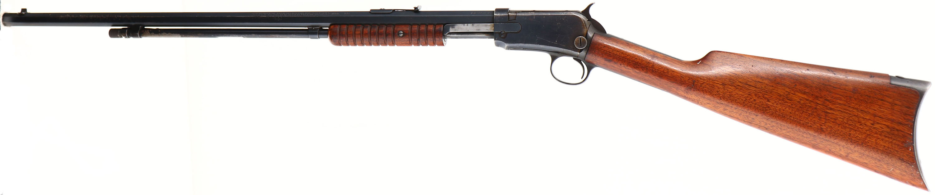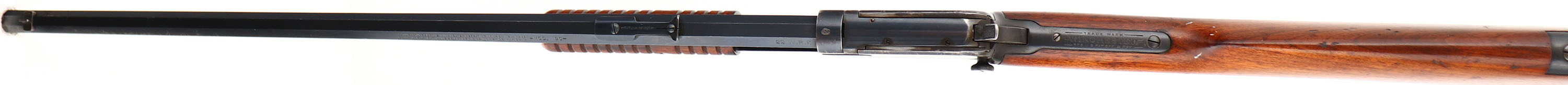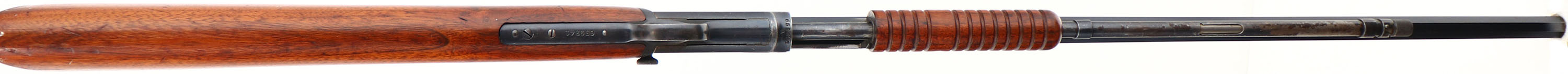 Winchester, Model 90, Third Variation, CAL: 22 WRF, MFG: 1920, SN: 659341, Pump Action Rifle, 24'' Octagon barrel. The original straight grip wood stock & corncob forend are excellent & solid. There is some light white paint speckling on the right side of the stock to the original finish. The stocks show some additional thinning & minor scratches or contusions. The original metal blue finish rates 80% on barrel, with some light speckling & spotting on the left side. Bluing rates 70% on the receiver & 50% on the mag tube. Bore is good, but with spotty areas of cleaned rust pitting or scarring. The barrel holds a standard rear & front sights. Buttstock carries a smooth crescent metal buttplate. Tight smooth action. A nice original example in the WRF caliber. FFL or C&R Req. - Value: 1400 to 2200