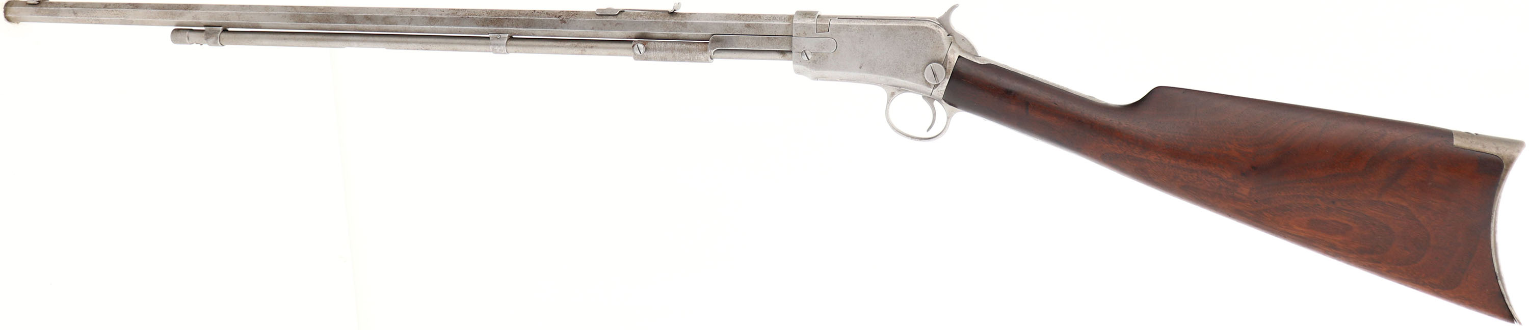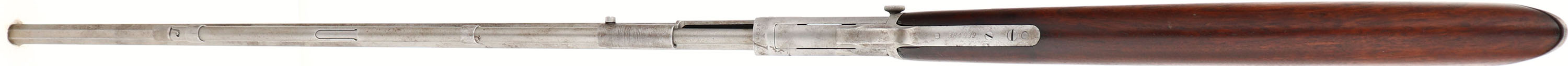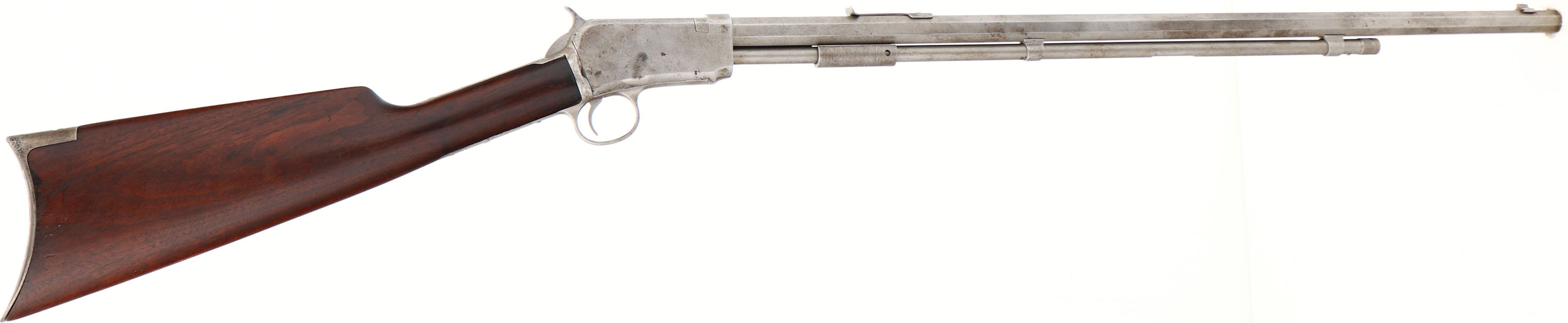 Winchester, Model 1890, 3rd model, .22 WRF Cal., MFG. 1908, SN:384539, Pump Action Rifle, 24'' octagon barrel. The original wood stock is very good & solid, carrying the original finish with some possible added oils over time. There is a 1.5'' stress crack at the receiver of the right wrist. The rifle is missing the forend. The original metal blue finish has been removed, giving the rifle a dull gray appearance, with some spotty areas of cleaned pitting. Bore remains good, with wear to the lands & grooves & some areas of roughness. Standard front & rear sights. Crescent metal buttplate. Upper tang missing a filler screw. With a forend & a bit of work, it appears to be a good restoration project. FFL or C&R Req. - Value: 300 to 500