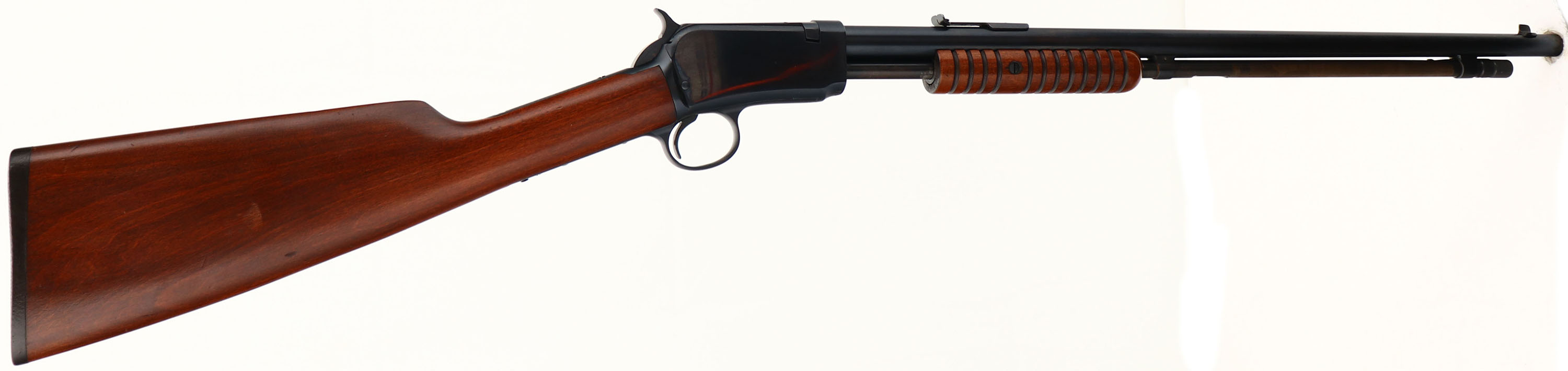 Winchester, Model 1906 , .22 S. L. LR., MFG: 1919, SN: 591898, Pump Action Rifle, 20'' Round barrel, The original straight grip gum wood stocks are excellent, with nearly all the original finish & virtually no rubs or handling marks except a shallow 1/2'' contusion in the middle right side of stock. The forend is of the grooved 1890 variety. The original metal blue finish on the barrel & receiver rates 98%, 50% on mag tube due to flaking loss. Bore is excellent. Fitted with standard barrel sights. Winchester plastic buttplate, with engraved screws. An original, overall excellent condition & collectible example. FFL or C&R Req. - Value: 2500 to 3500