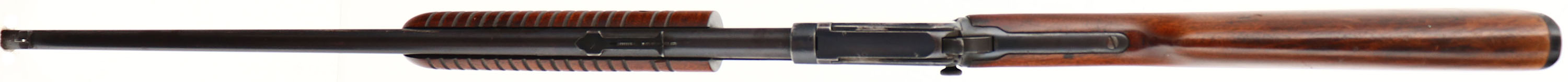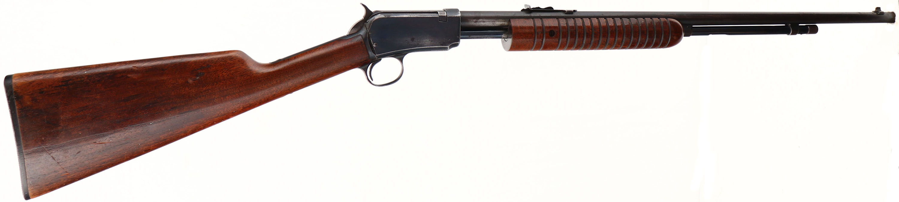 Winchester Model 62A, marked .22 S.L or L.R., MFG.1946, SN:171981, Take-down. Pump Action Rifle, 23'' round barrel. The original factory straight grip wood stocks are excellent, with some minor scratches, handling marks & contusions to the thinning original finish. The original metal blue finish is 80% on receiver & mag, 70% on barrel, starting to gray as it thins on the barrel. Bore is excellent. Barrel is fitted with factory sights. Factory buttplate. An very nice original example. FFL or C&R Req - Value: 500 to 1000