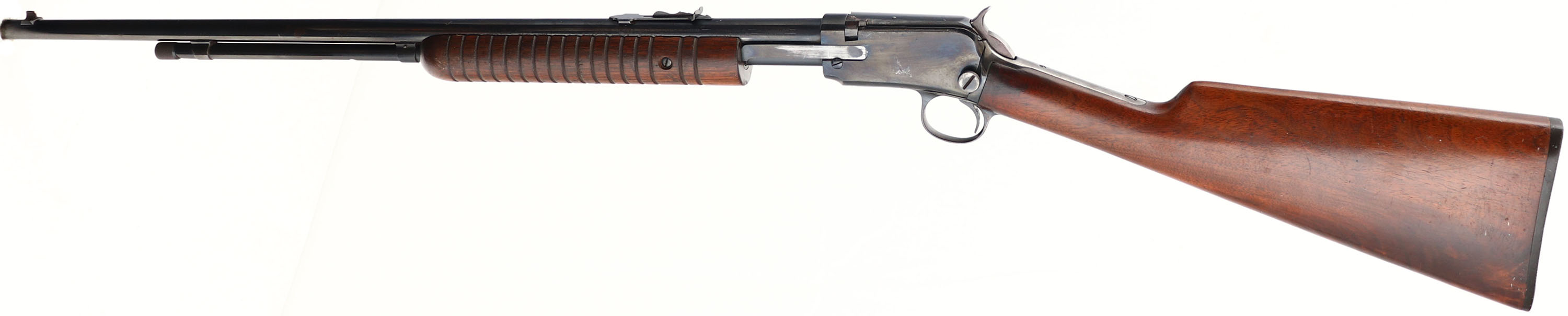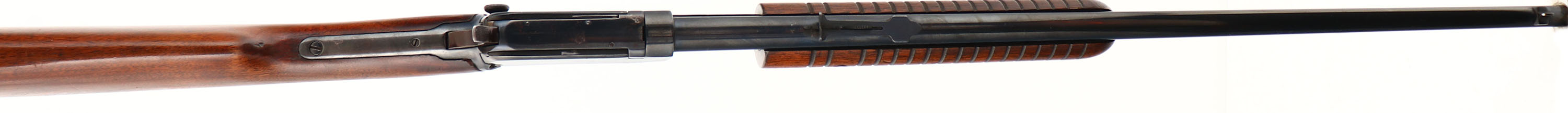 Winchester Model 62A, marked .22 S.L or L.R., MFG.1941, SN:124450, Take-down. Pump Action Rifle, 23'' round barrel. The original factory straight grip wood stocks are very good & solid despite a glue repaired stress crack that runs the length of the forend. The stock displays very nice rippled grain, which is well above average, with some minor scratches, handling marks & contusions to the original finish. The restored metal blue finish rates 80% on receiver, 90% on barrel & mag. Bore is excellent. Barrel is fitted with factory sights. Factory buttplate. WARNING, the hammer on the rifle does not stay back when pumped & therefore slam fires. The rifle may have been misassembled when reblued or may be missing a part. Therefore, this gun is being sold ''AS-IS'' as a parts rifle, with no returns, & should not be loaded or attempted to fire before being worked on by a professional gunsmith. FFL or C&R Req - Value: 200 to 400