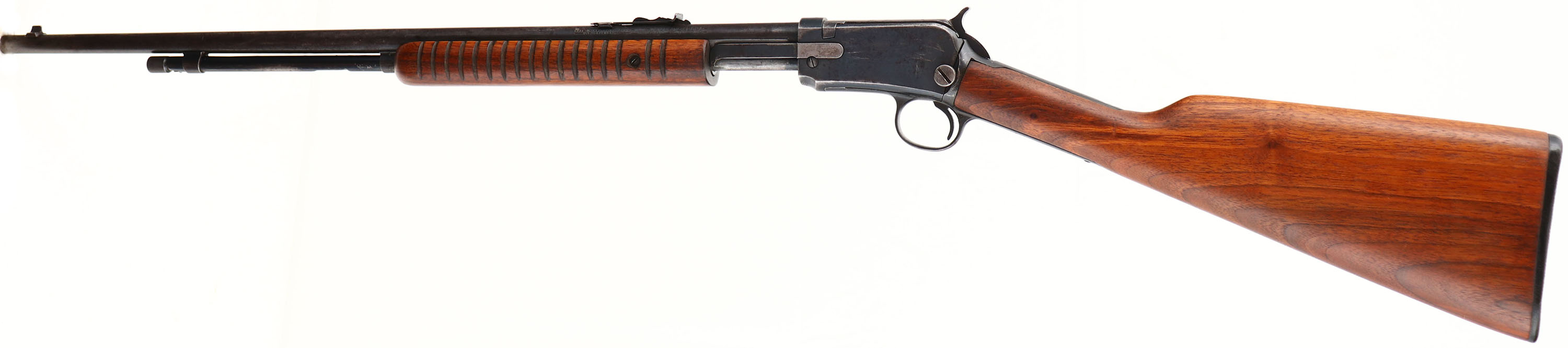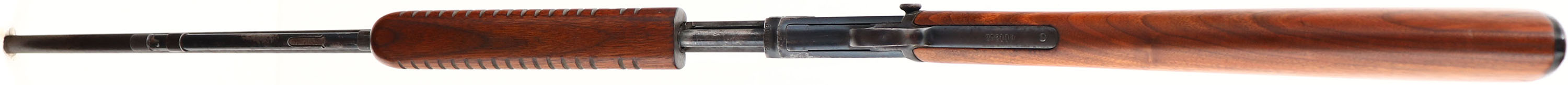 Winchester Model 62A, marked .22 S.L or L.R., MFG.1950, SN: 282119, Take-down. Pump Action Rifle, 23'' round barrel. The original factory straight grip wood stocks are very good, having been stripped, lightly sanded & reoiled. There are virtually no remaining handling marks. The original metal blue finish is 70% on receiver & mag, with 50% coverage of remaining finish toning to a brown patina on barrel. There are areas of light pitting on the metal surfaces. Bore is good & clean, but with areas of scarring. Barrel is fitted with factory sights. Factory buttplate. A solid old pump Winchester. FFL or C&R Req - Value: 350 to 700