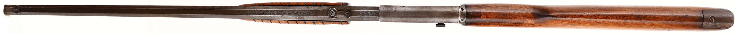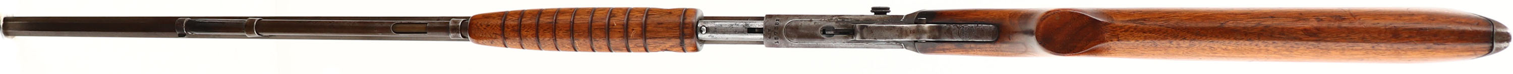 Remington, Model 12C, .22 S. L. & LR., MFG. 1909-36, SN:137382, Pump Rifle, Take-down, 24'' Octagon barrel. The original flat pistol grip wood stocks are good, having been sanded & refinished. There is a filled hole at the top of the wrist from the previous mounting of a Marbles tang sight, as well as some oil staining & minor handling marks or contusions. The metal finish has worn mostly gun metal gray, with a thin brown patina developing. Fitted with standard front & rear sights. Bore is very good, with some light roughness. Original crescent metal buttplate. FFL or C&R Req. - Value: 250 to 500