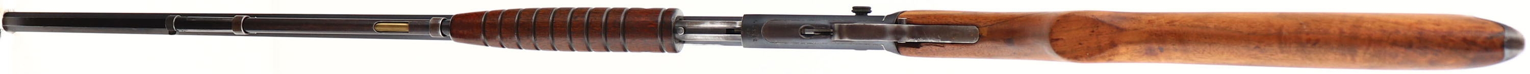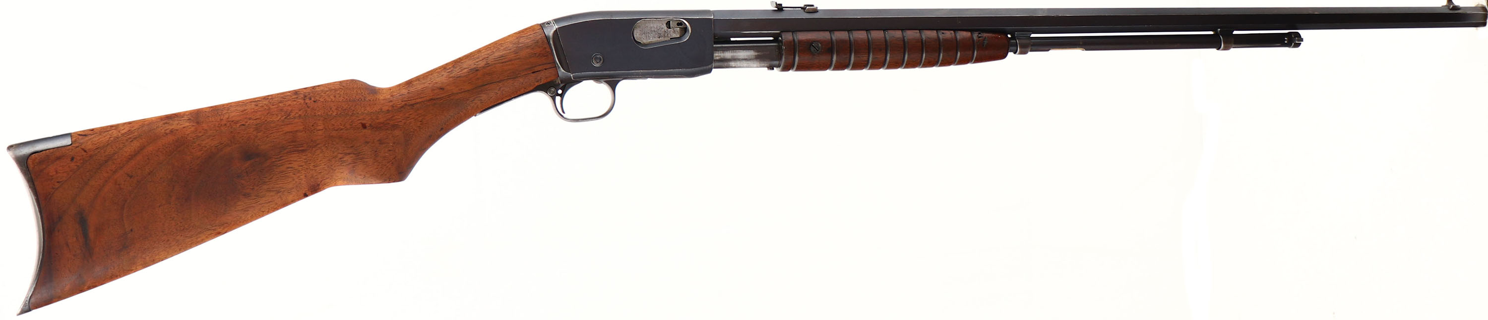Remington, Model 12B Gallery Special, .22 SHORT, MFG. 1909-36, SN: 38517, Pump Rifle, Take-down, 24'' Octagon barrel. The original flat pistol grip wood stocks are fair, but solid after a wrist repair of a full linear break on both sides of wrist. Some fill was used with the glued repair & the stock was fully sanded at time of repair, with a hand oil finish applied. There are some minor handling marks or contusions remaining. The original metal blue finish rates 75% overall. Fitted with standard front & rear sights. Bore is excellent. Original crescent metal buttplate. FFL or C&R Req. - Value: 250 to 500